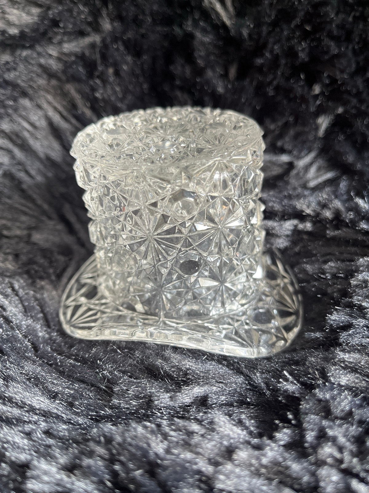 A charming pressed-glass novelty item shaped like a Victorian top hat, featuring the classic 'Daisy and Button' pattern.