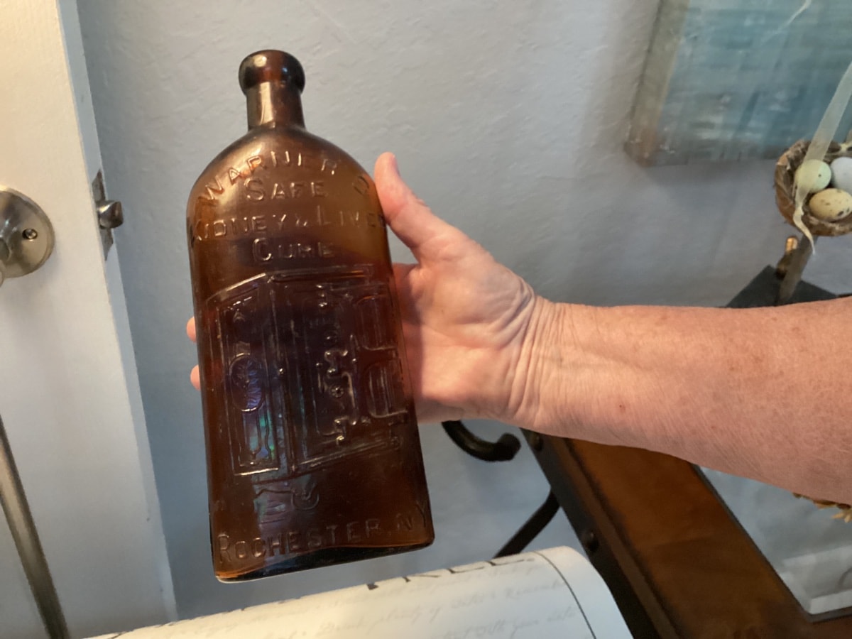 A classic amber glass 'patent medicine' bottle featuring a bold embossed safe on the front. This iconic vessel once held a mixture of herbs, water, and a significant amount of alcohol, marketed as a cure-all for internal ailments.
