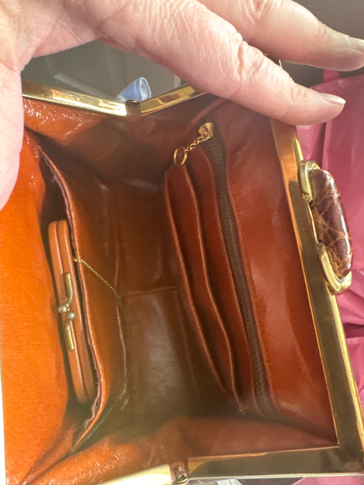 A sophisticated structured handbag crafted from high-gloss genuine crocodile belly skin, featuring a gold-tone metal frame and a unique skin-covered clasp. The interior is lined in supple tan leather and includes a rare matching coin purse attached by a delicate brass chain.