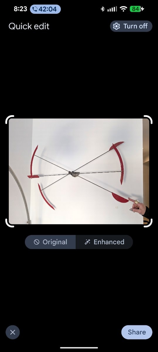 A dynamic kinetic wall sculpture featuring painted red crescent-shaped vanes balanced on slender wire arms. This piece is a 'stabile-mobile' hybrid, designed to interact with air currents while anchored to a vertical surface, echoing the revolutionary work of Alexander Calder.