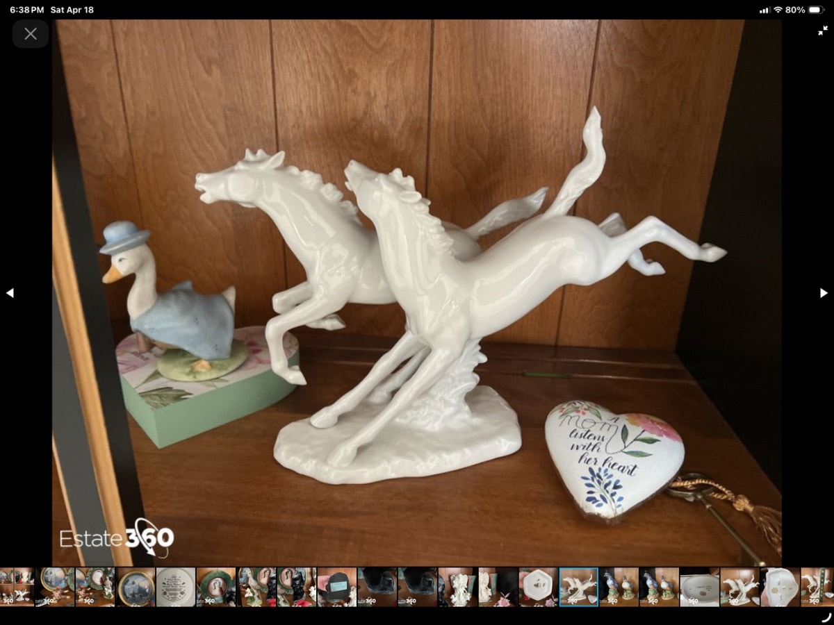 The figurine appears to be in excellent condition with a bright, consistent glaze. The most critical areas to inspect are the thin ankles and ears of the horses, where chips or professional repairs can significantly impact value. Excellent condition commands the top of the price range.