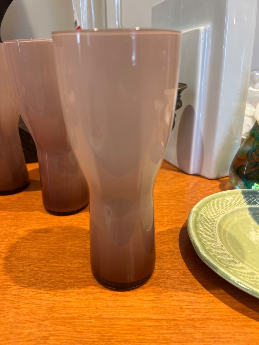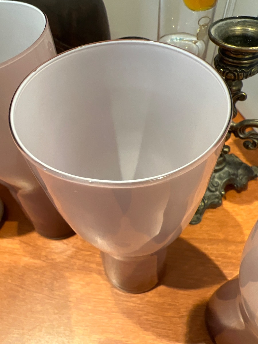 A sophisticated set of five hand-blown tumblers featuring the 'incamiciato' (jacketed) technique with an opaque white interior and a smoky mauve exterior.