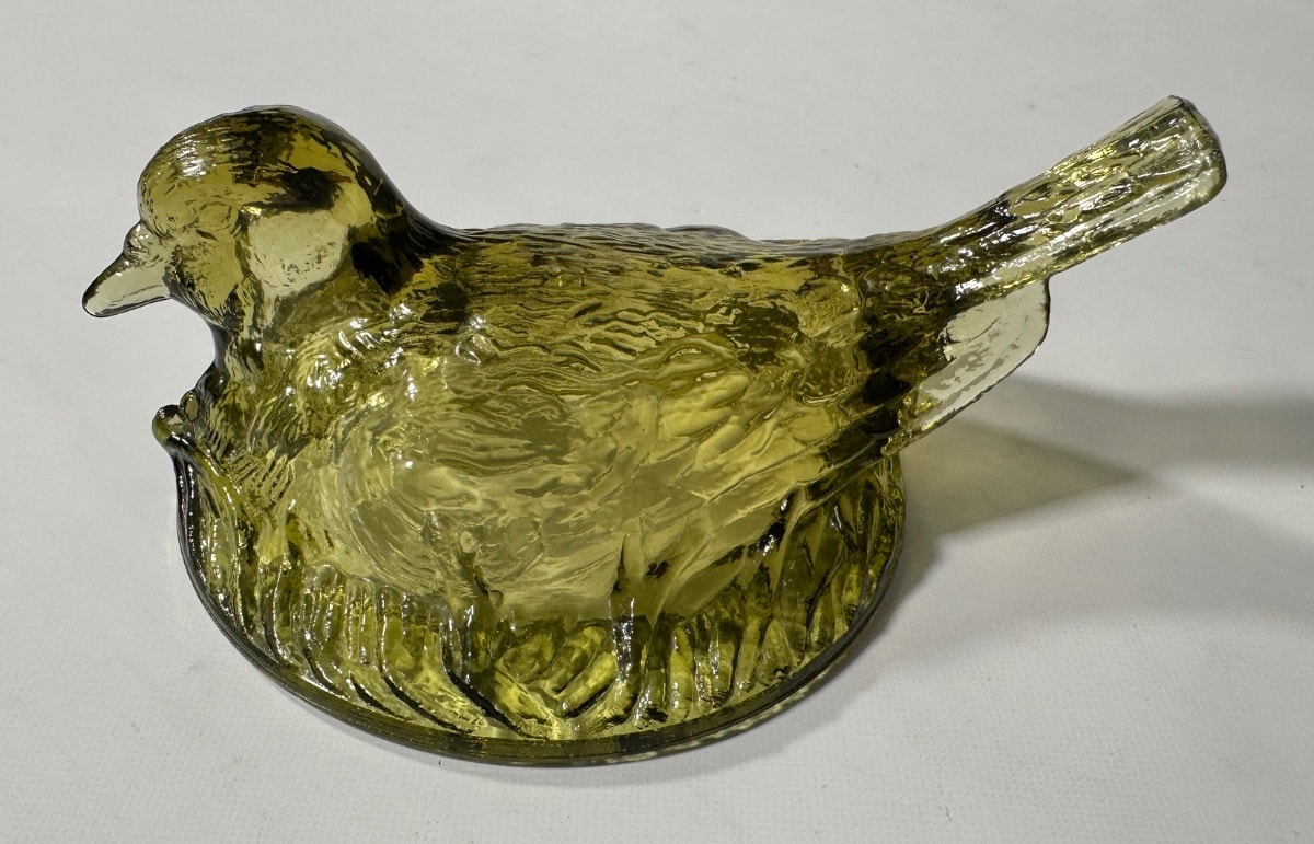 The glass appears clear with no significant clouding or 'sick glass' syndrome. The beak and tail feathers, which are the most vulnerable points, appear intact in the photos. Check the inner rim of the nest for small 'flea bite' chips, as these common defects can reduce the value by 20-30%.