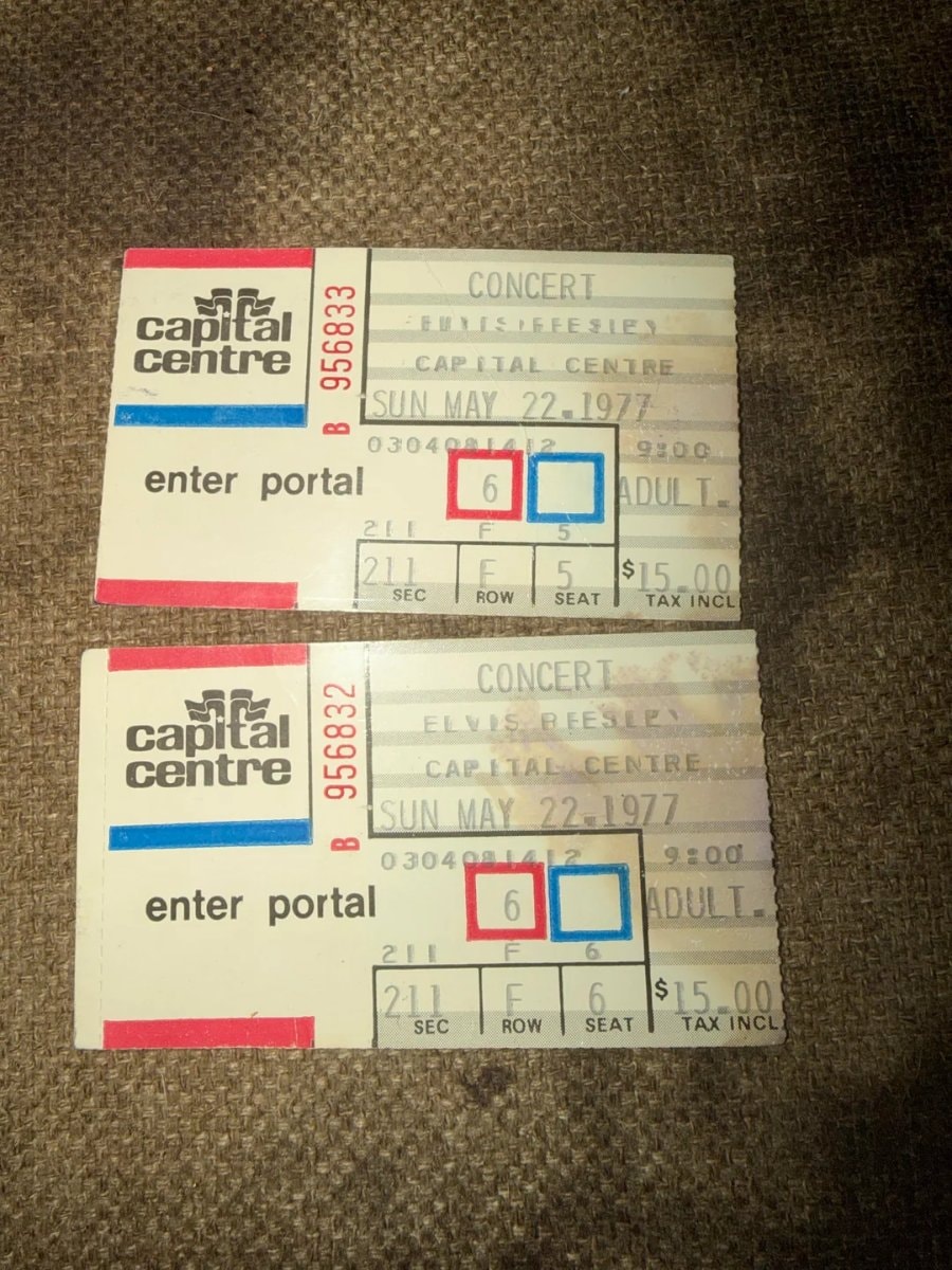 These ticket stubs were issued by the Capital Centre in Landover, Maryland, for Elvis Presley's May 22, 1977 performance. This concert took place during his final tour period, just three months before his passing in August 1977.