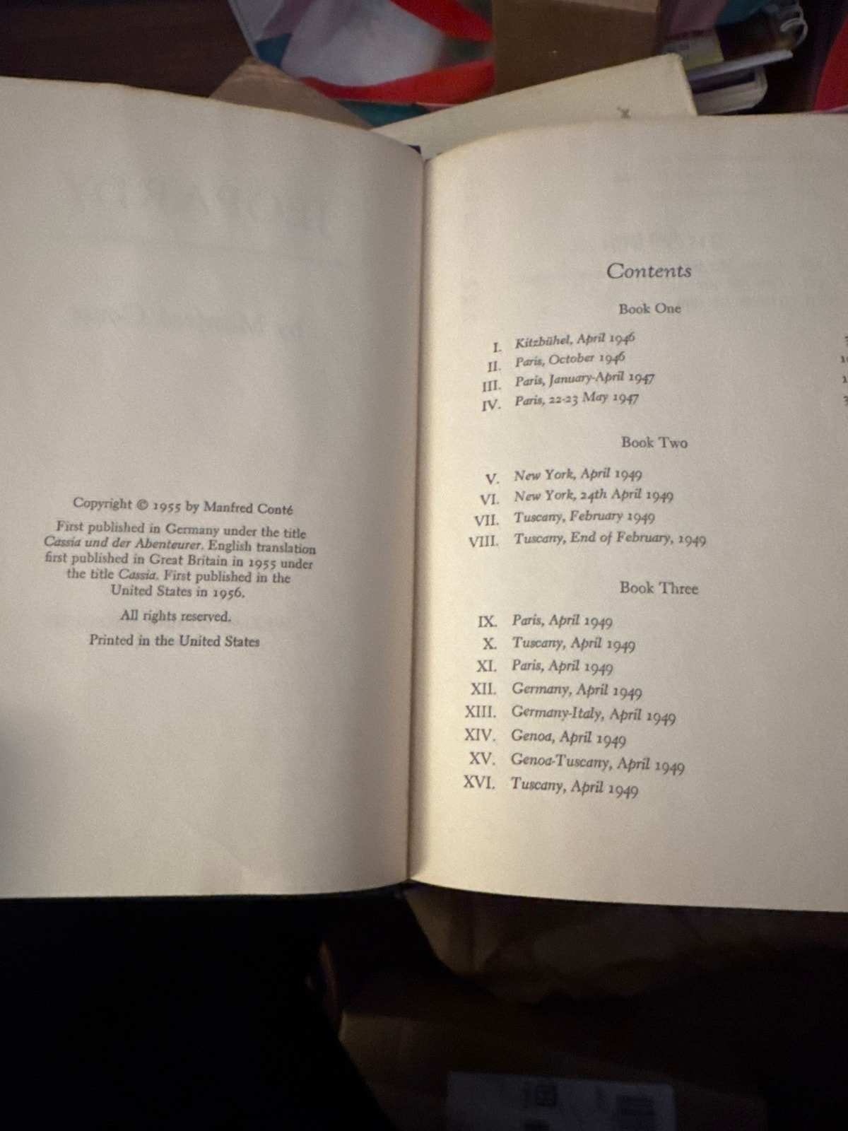 This is the 1956 first American edition of Manfred Conté's high-stakes thriller, originally published in Germany as 'Cassia und der Abenteurer'. It is a quintessential example of mid-century suspense literature, capturing the tense, nomadic atmosphere of post-WWII Europe.
