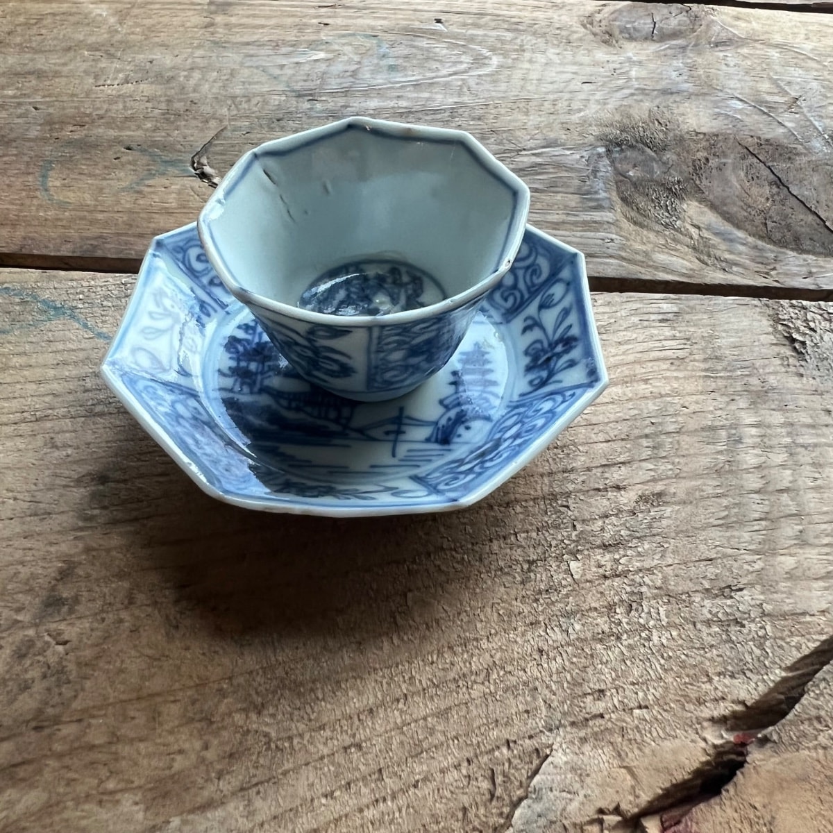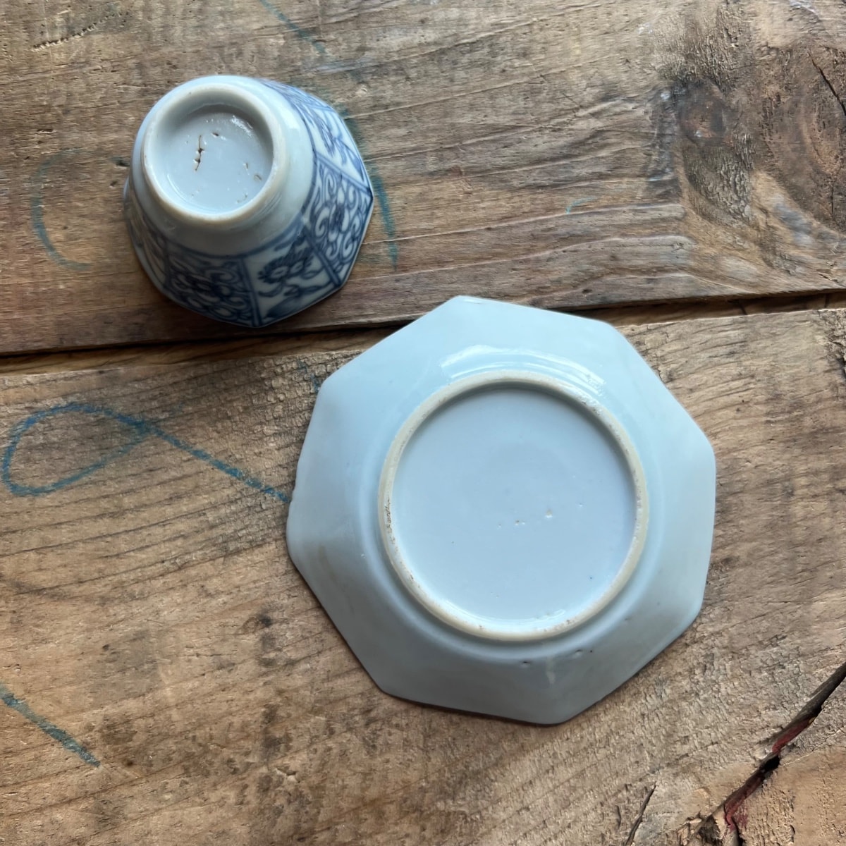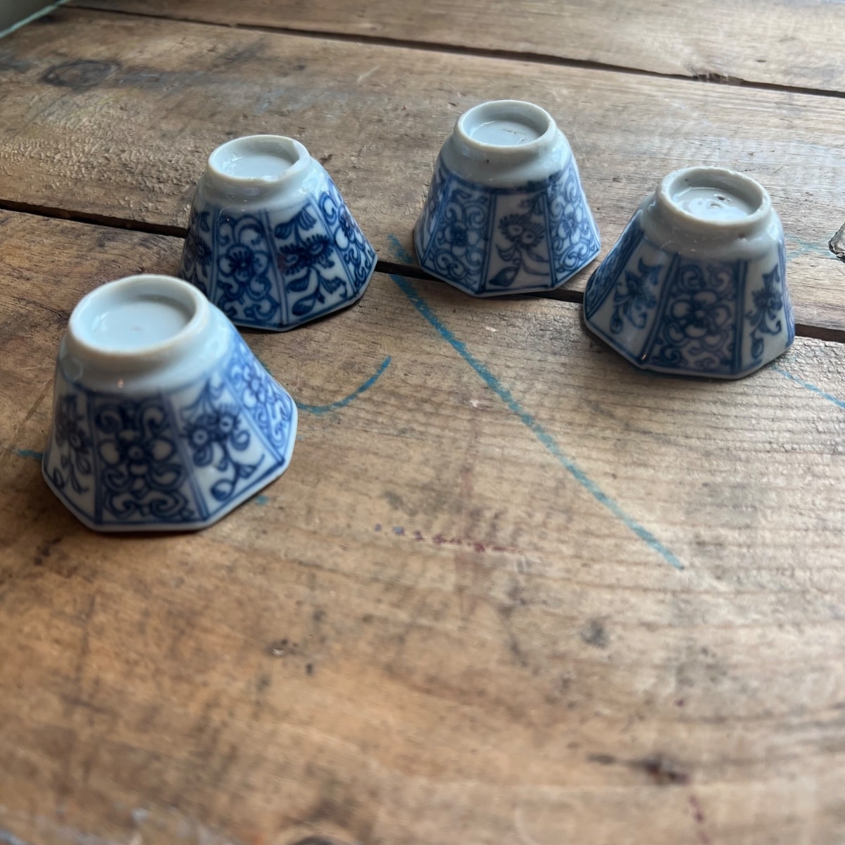 The pieces show typical kiln grit and minor firing flaws consistent with age. One cup appears to have a visible hairline crack or deep scratch on the interior rim which significantly impacts its individual value. The glaze remains bright and the cobalt has not faded. Condition reduces value by roughly 20% compared to a pristine set.
