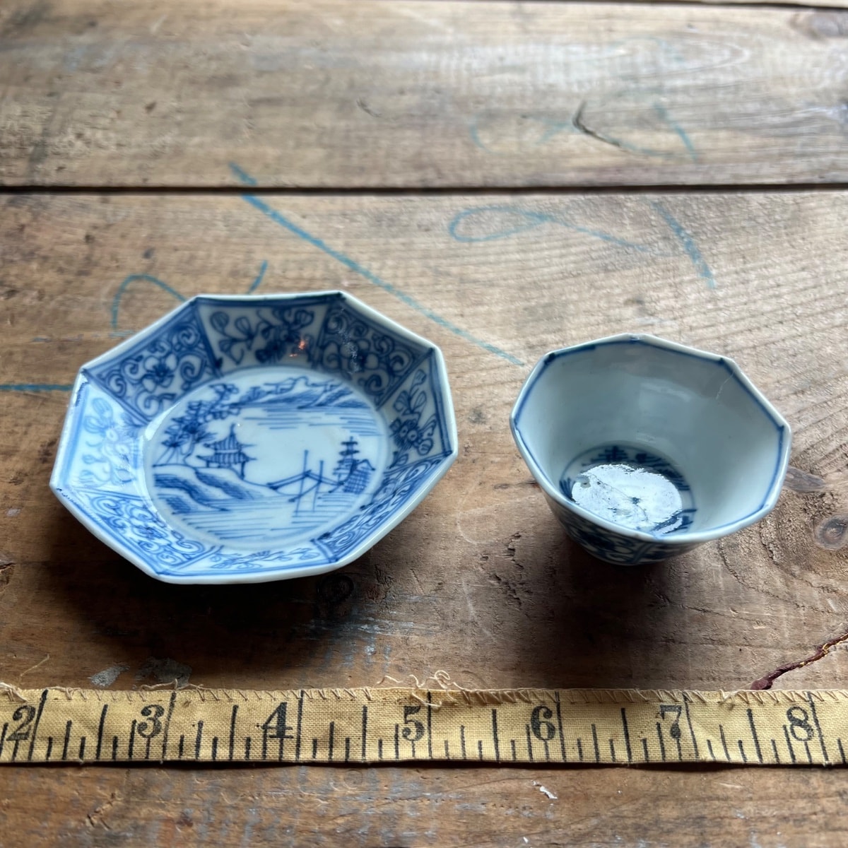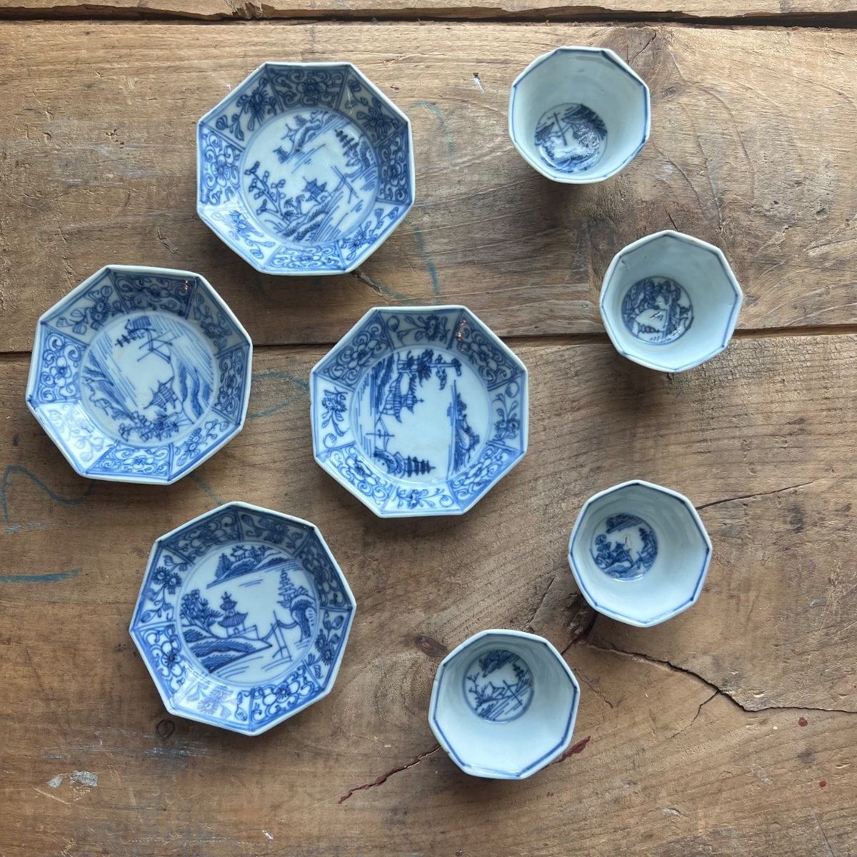 A charming assembly of octagonal porcelain tea or dipping cups (soba choko) and matching small plates (mame-zara) featuring hand-painted cobalt blue landscapes. The faceted shape is a classic departure from the standard round form, designed to catch the light and provide a better grip.