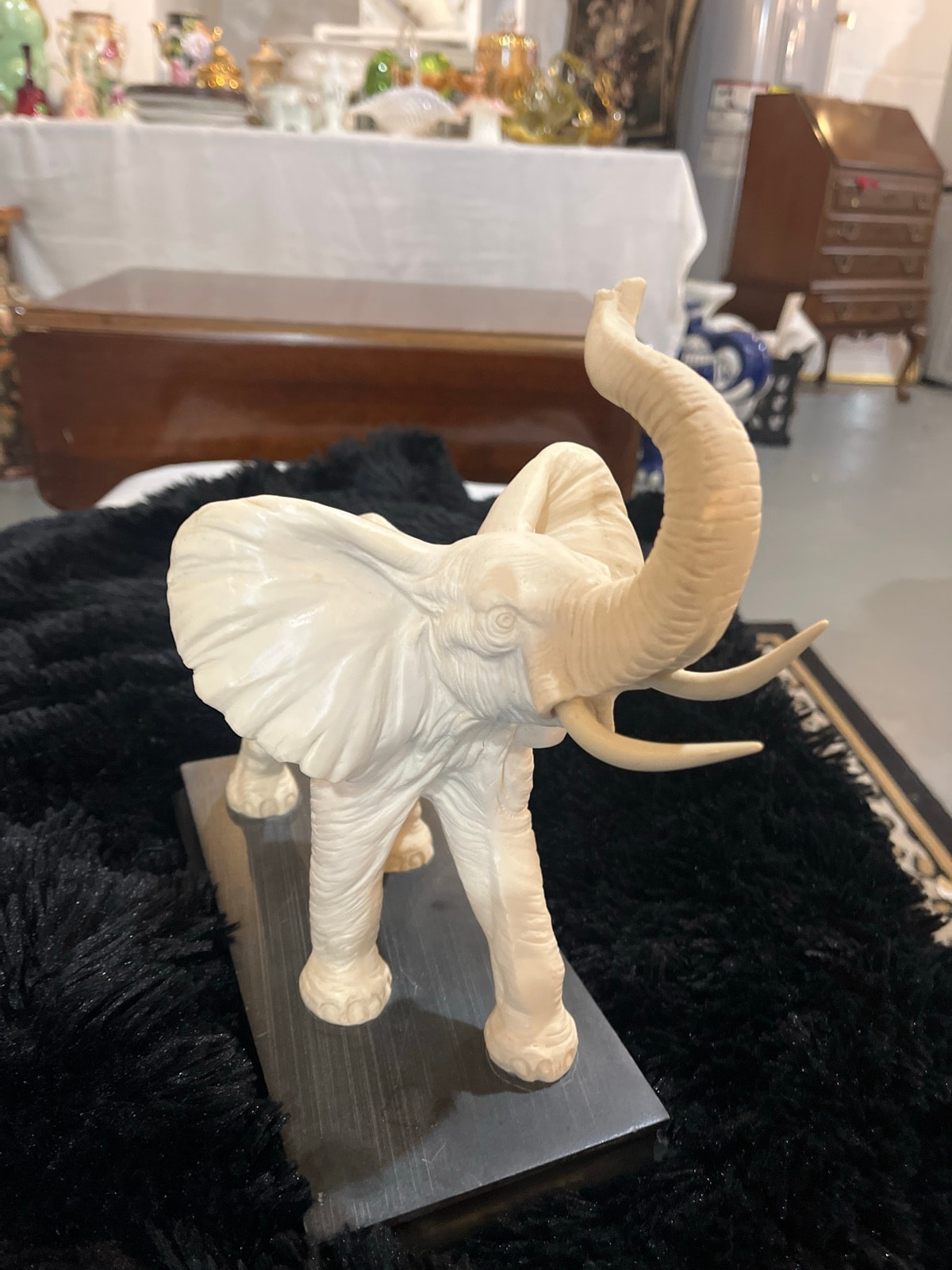 The sculpture appears to be in excellent condition with no visible chips to the ears or tusks, which are the most vulnerable points. The surface has a nice consistent patina. Excellent condition maintains the higher end of the value range. Value is driven by the size and the lack of visible damage to the delicate tusks or trunk.
