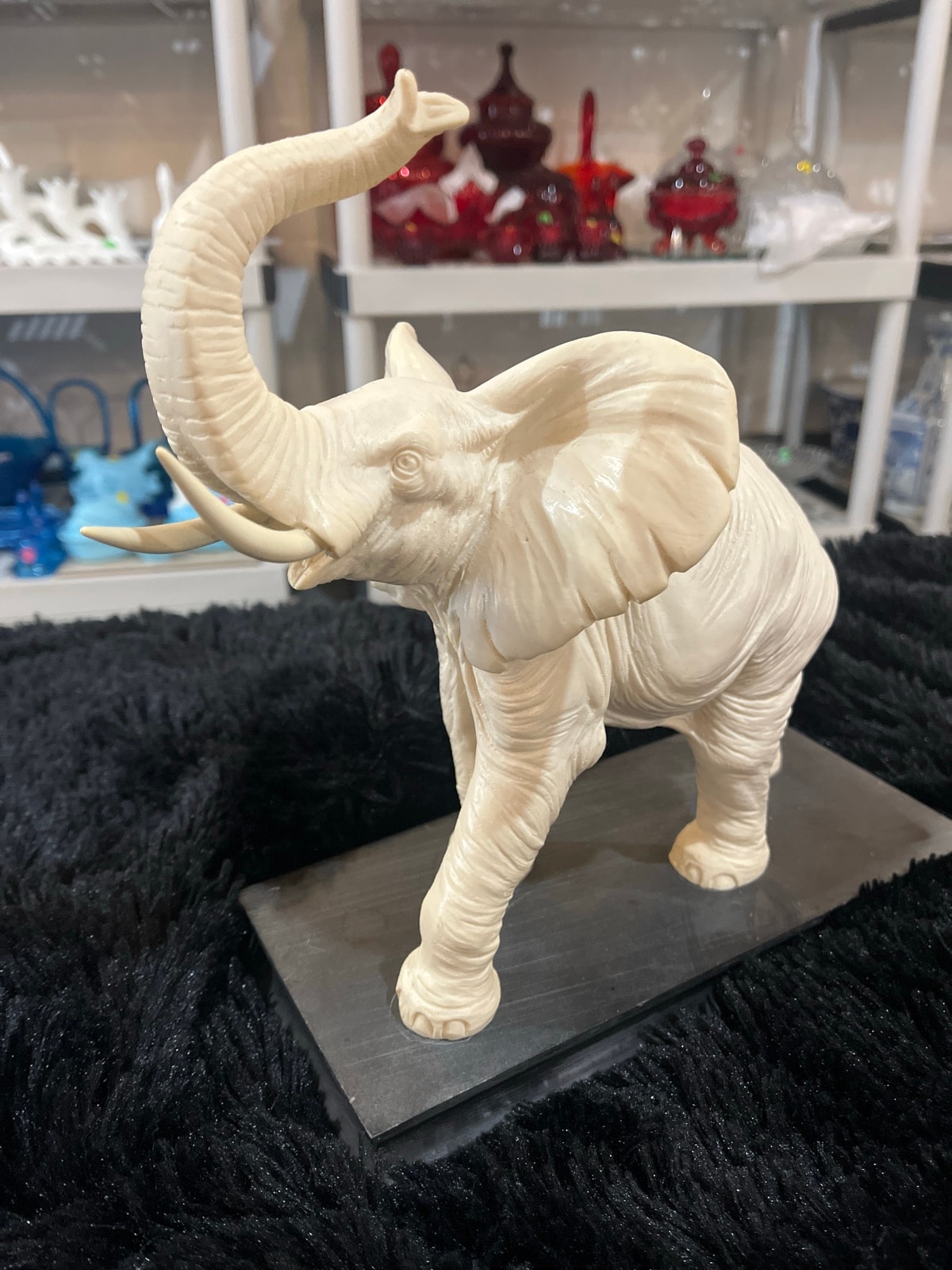 A dynamic and highly detailed sculpture of an African elephant with its trunk raised in a gesture of good fortune. This piece captures the majestic texture of elephant hide and the fluid movement of the animal, mounted on a sleek, contrasting plinth.