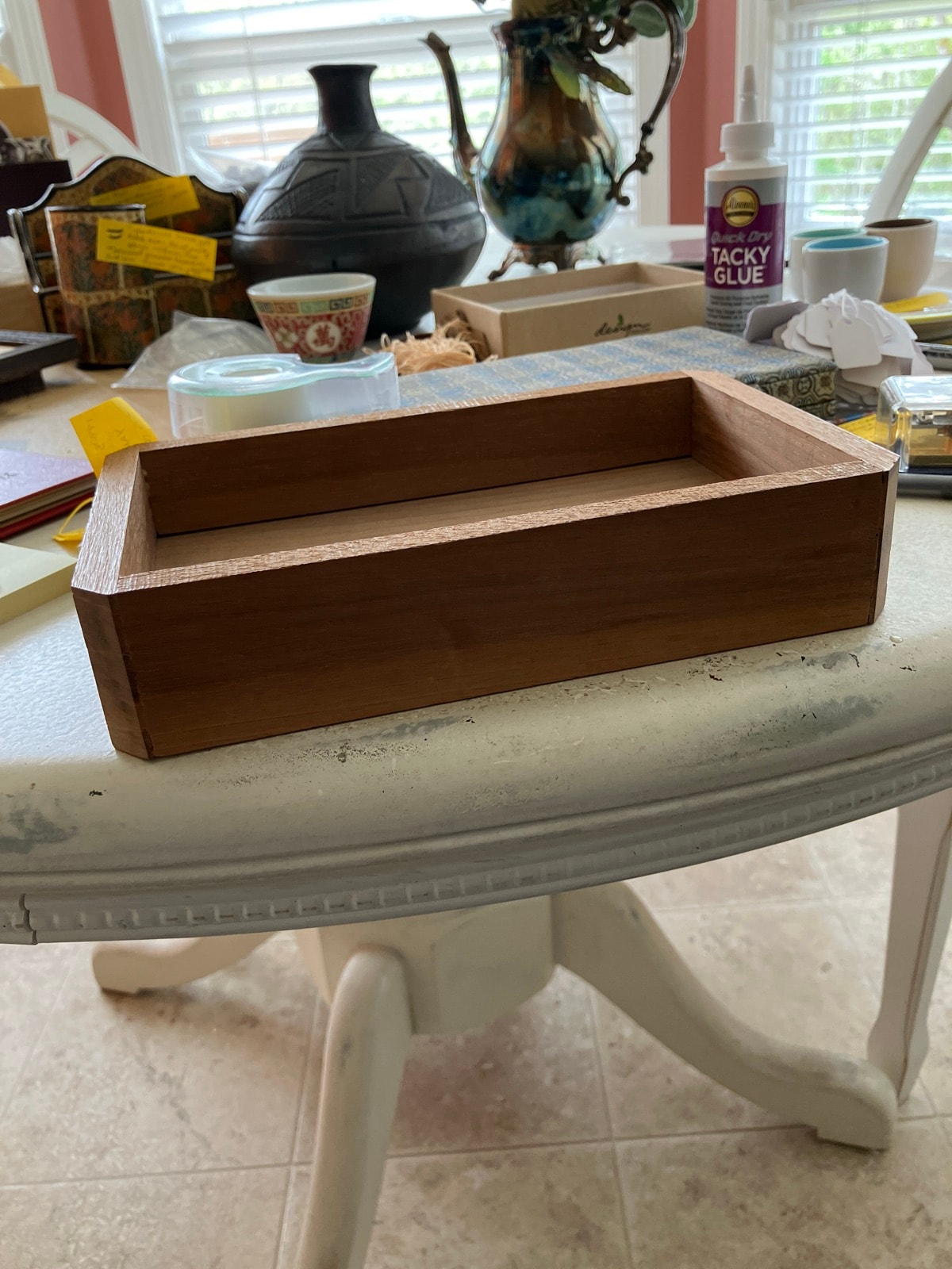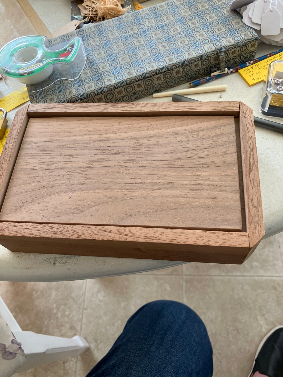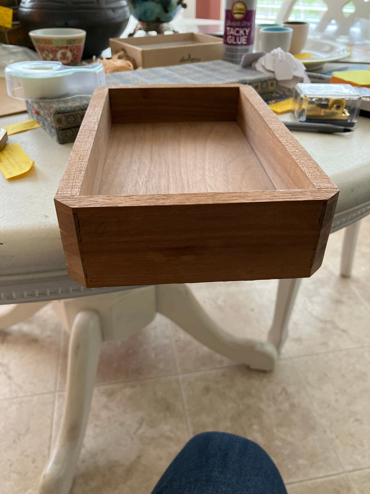 The box appears to be in excellent structural condition with tight joints. There are minor surface scuffs consistent with age, but no significant warping or cracking. The presence of the original pencil mark suggests it has been well-preserved and not over-sanded.