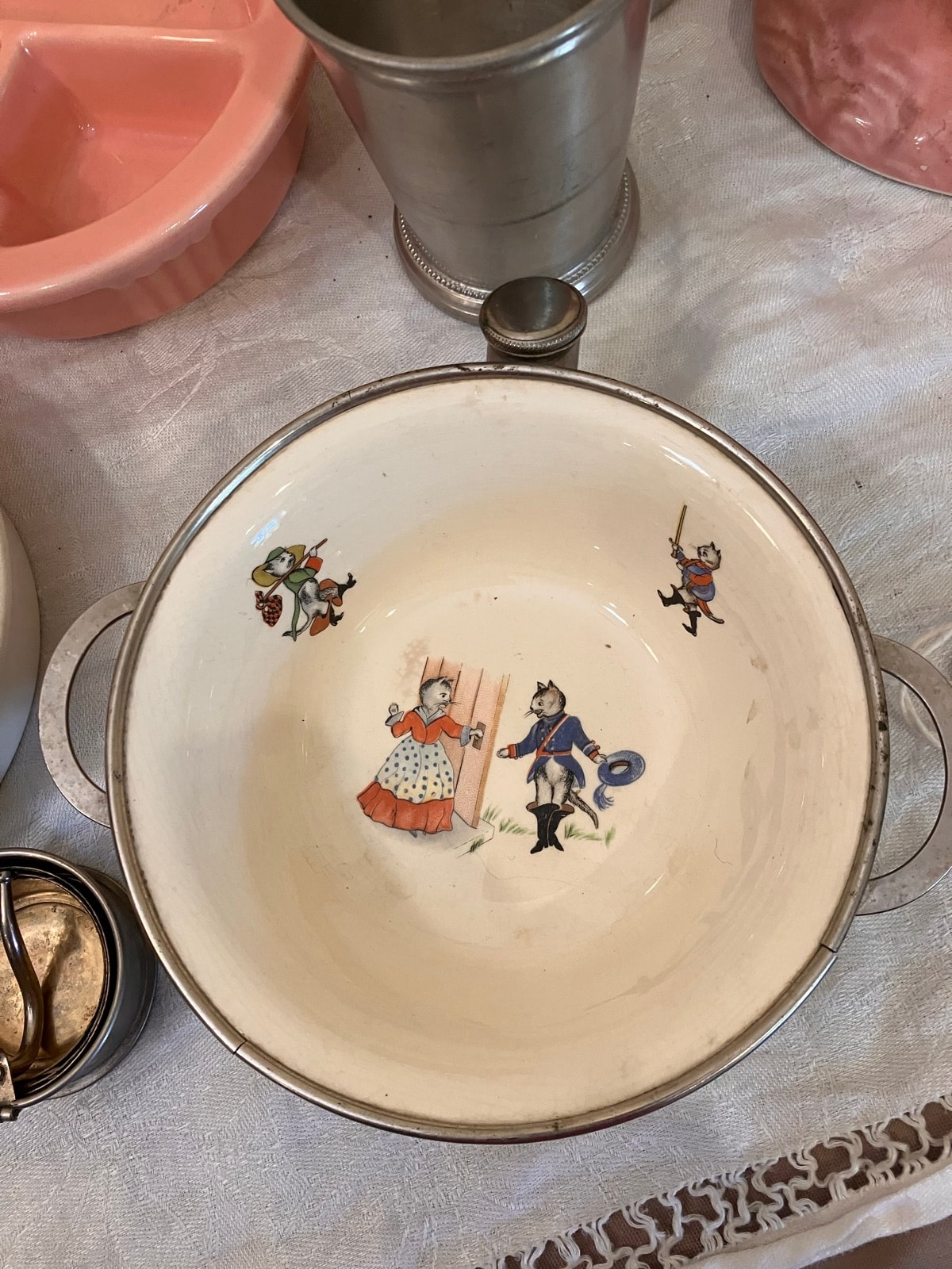 Victorian parents obsessed over nursery hygiene and temperature. This bowl used a hot water reservoir to ensure slow-eating toddlers had a warm meal. The cat illustrations reflect the era's love for 'Puss in Boots' style fables.