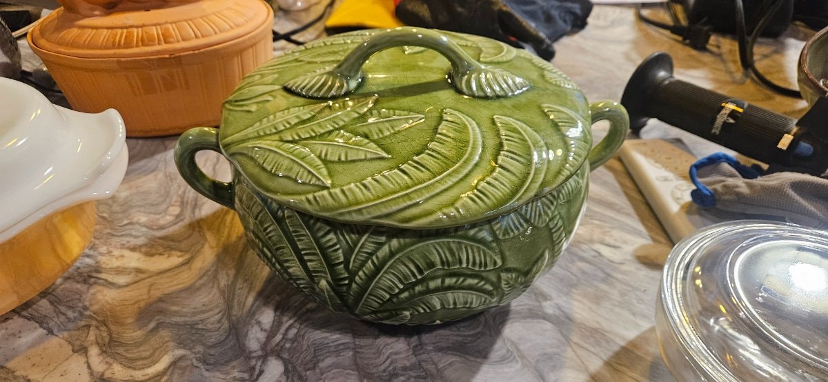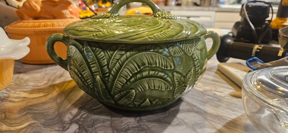A vibrant green majolica lidded tureen or casserole dish featuring deeply embossed banana leaf motifs and a high-gloss lead glaze. This style of 'naturalistic' pottery is a hallmark of Portuguese ceramic tradition, designed to bring the lushness of the garden directly to the dining table.