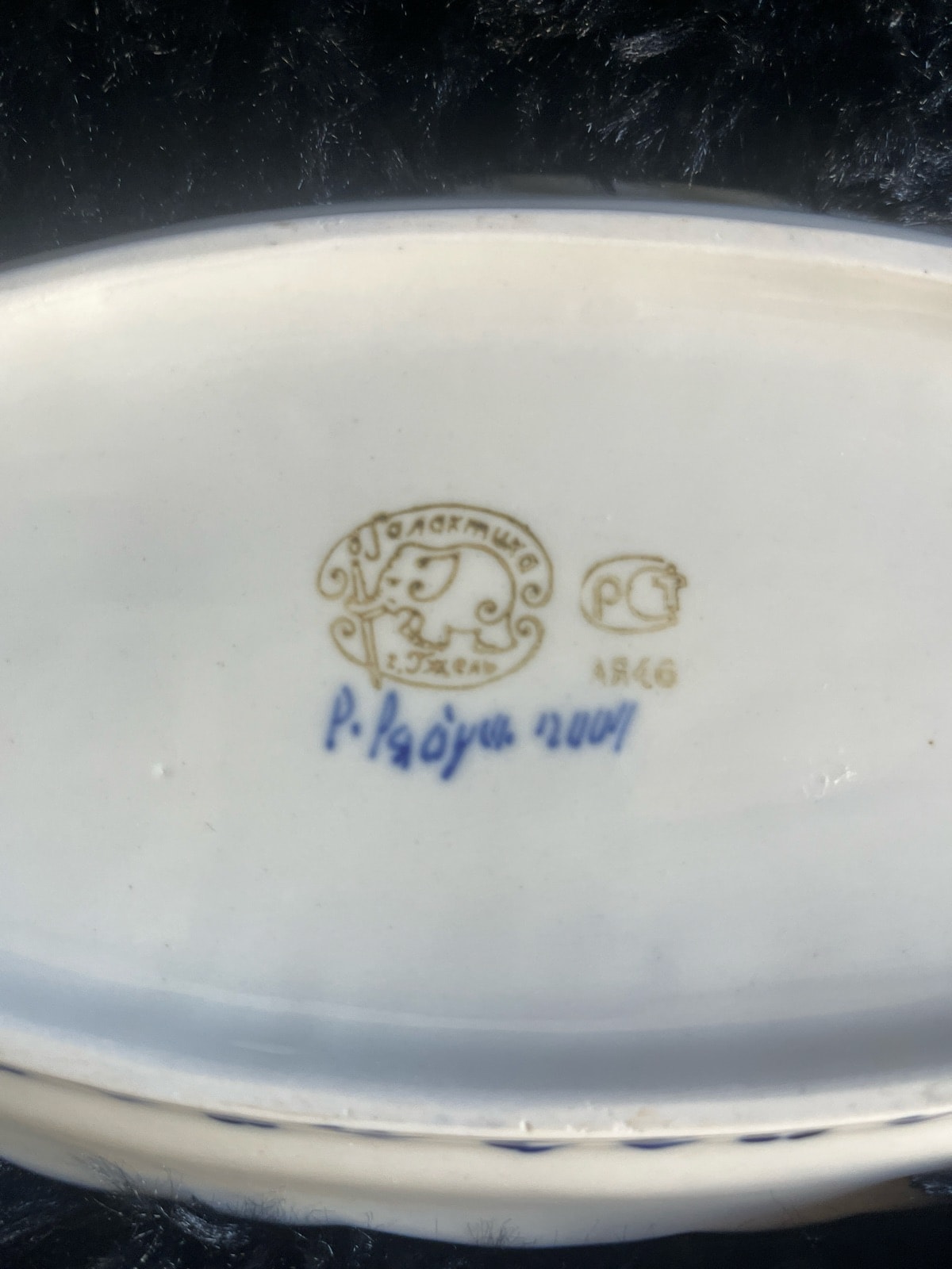 The piece appears to be in excellent condition with no visible chips, cracks, or crazing to the glaze. The cobalt remains vibrant and the underside markings are crisp and legible. Excellent condition is expected for decorative cabinet pieces of this age. Modern Gzhel pieces from the early 2000s are widely collected but plentiful.