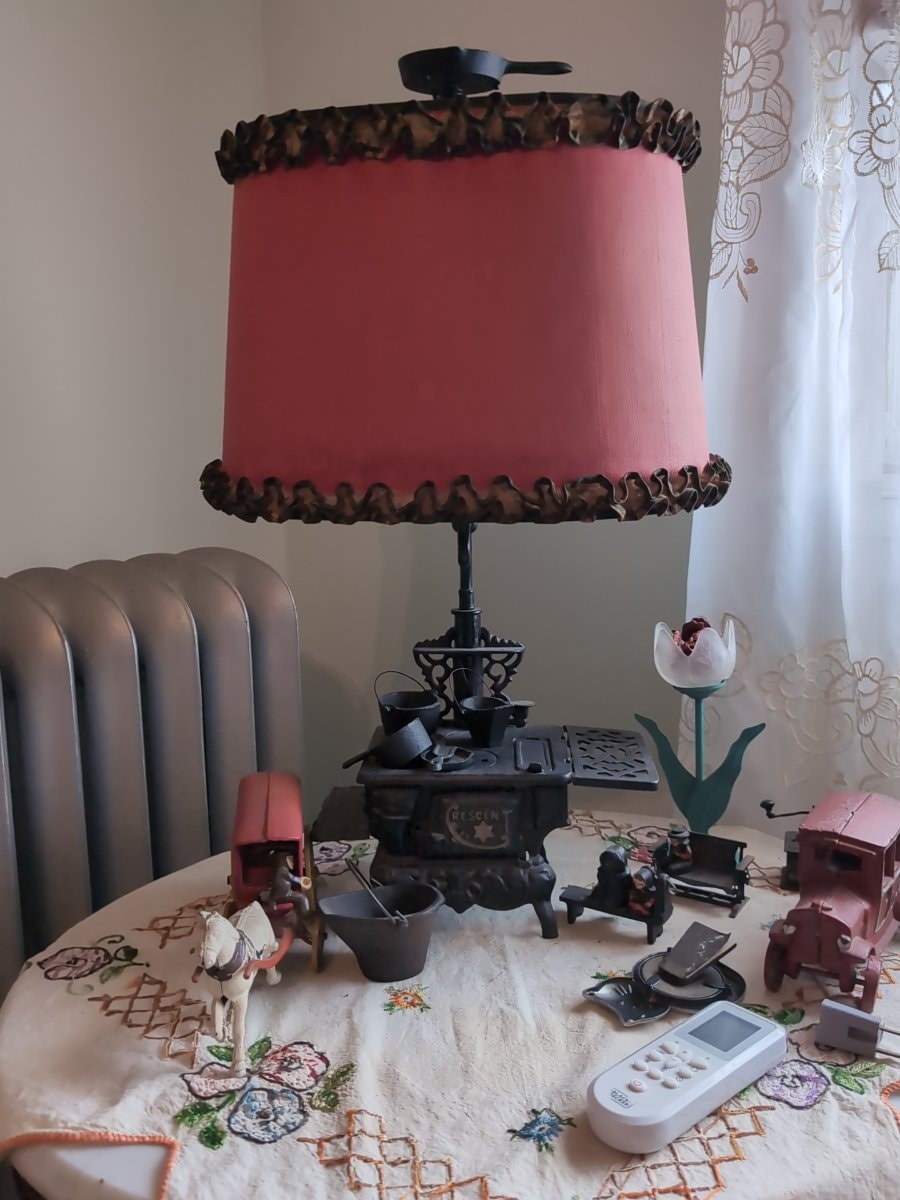 In the 1950s, the Grey Iron Casting Company revived 19th-century molds to satisfy a wave of American nostalgia. While often called 'salesman samples,' these were actually heavy-duty toys meant to teach children the mechanics of a Victorian kitchen. This piece was later transformed into a lamp, a popular mid-century trend for 'Early American' home decor.