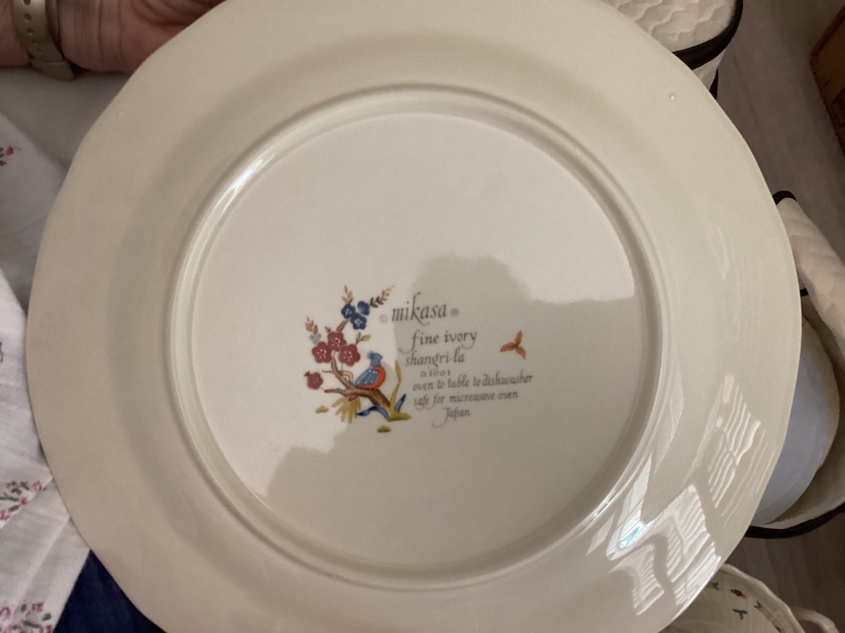 A sophisticated example of Japanese-made dinnerware, this plate features a delicate Chinoiserie bird-and-blossom motif set against a warm 'Fine Ivory' ceramic body.