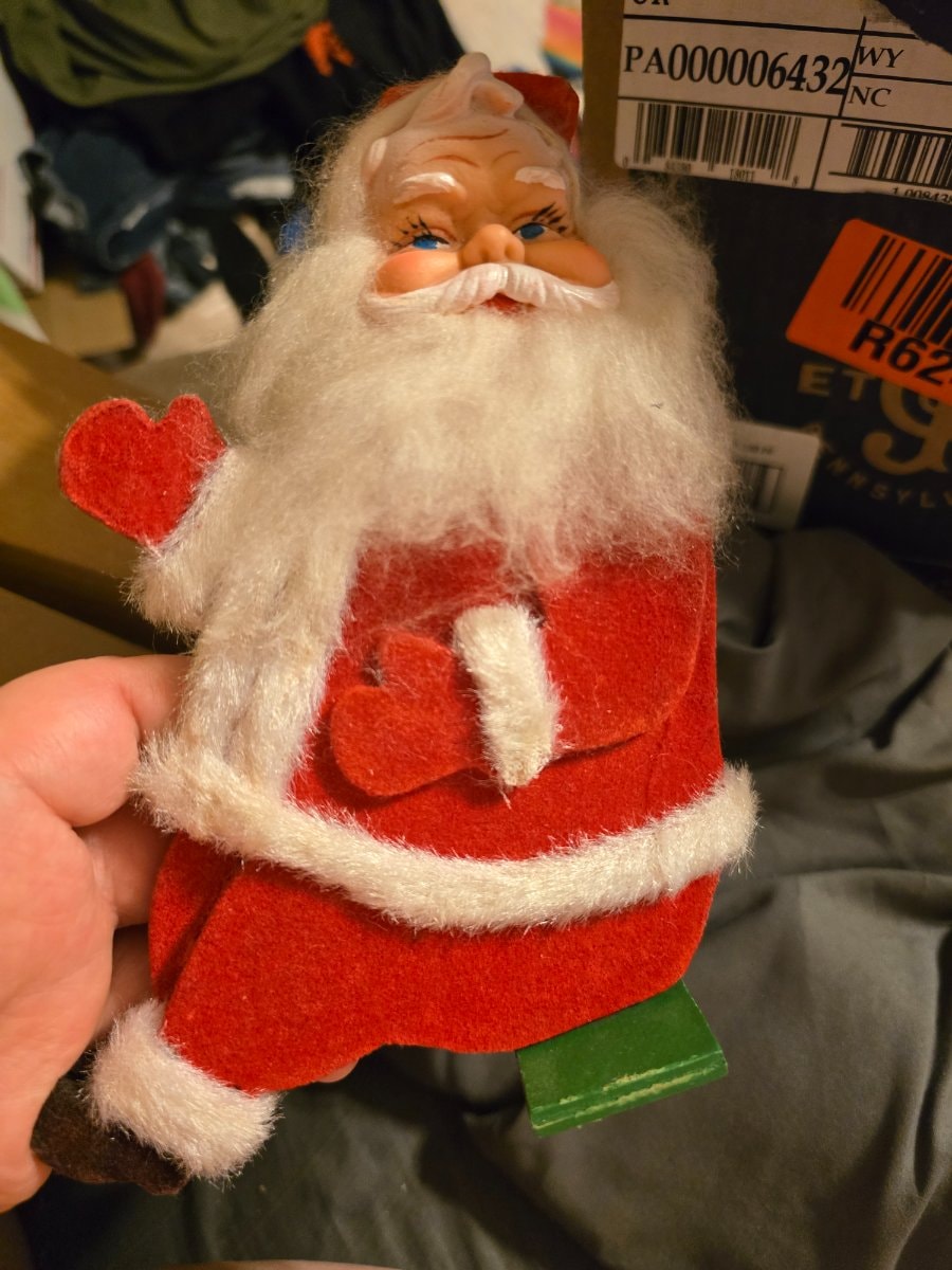 A classic piece of Mid-Century Modern holiday kitsch, this Santa features a hand-painted vinyl face paired with a soft, flocked body.