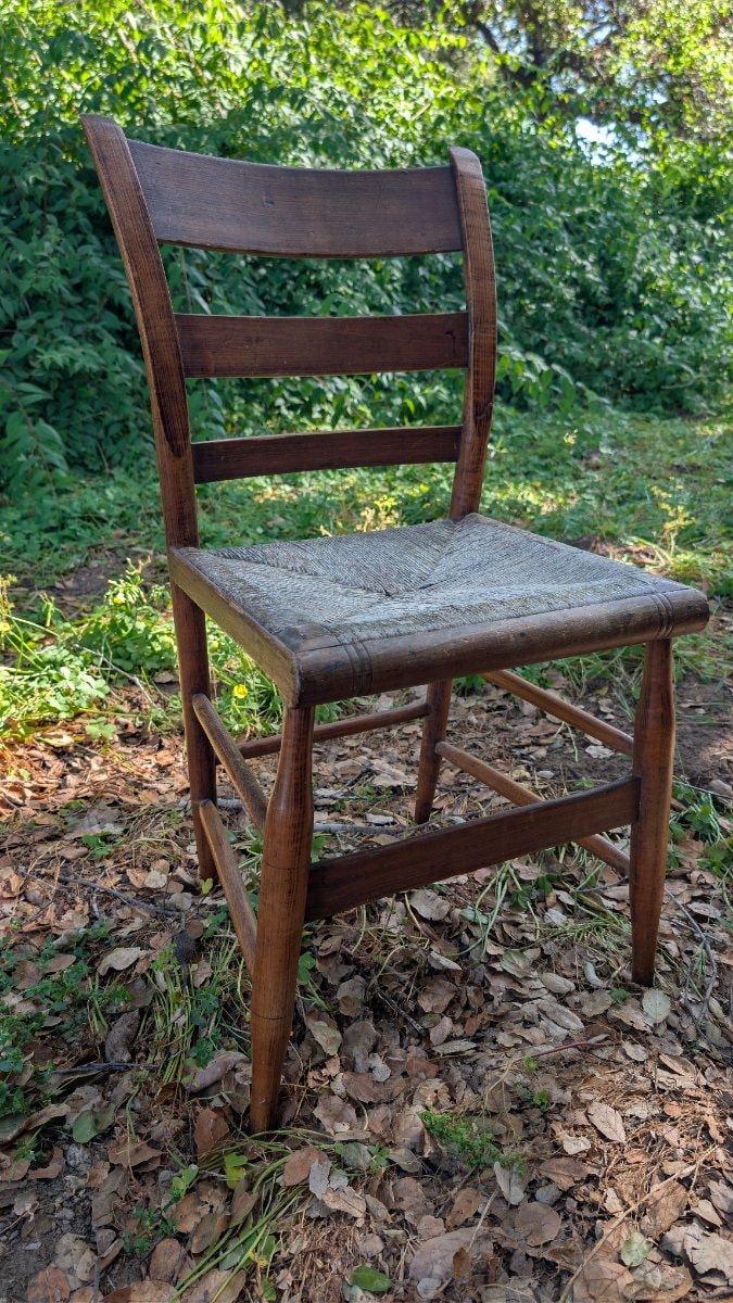 A classic vernacular ladder-back side chair featuring two horizontal slats and a hand-woven rush seat. This piece exemplifies the 'country' style, blending utilitarian durability with the elegant, tapered lines of traditional American folk furniture.