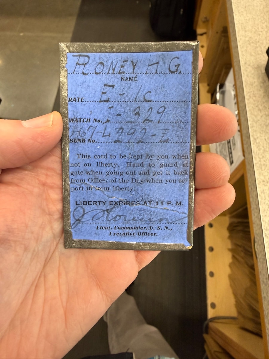 During WWII, this small blue card was a sailor's most prized possession—it was their ticket to freedom from the cramped, steel confines of a warship. Without it, a sailor couldn't pass the gate guard or 'Officer of the Day' to enjoy a few hours of 'liberty' in port. This specific card belonged to a sailor named Roney, who likely bought this metal frame to ensure his pass didn't disintegrate in his pocket during months at sea.
