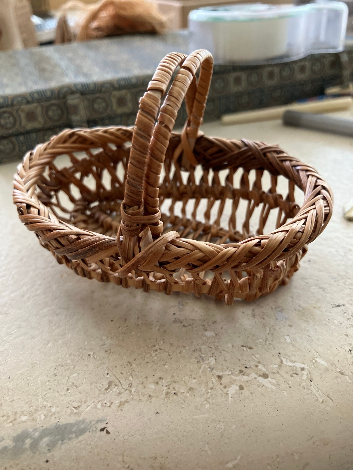 The basket appears to be in excellent vintage condition with no visible breaks in the weavers or handles. The natural honey-colored patina is consistent with age and adds to its character. Excellent condition for such a fragile item commands the higher end of the range.