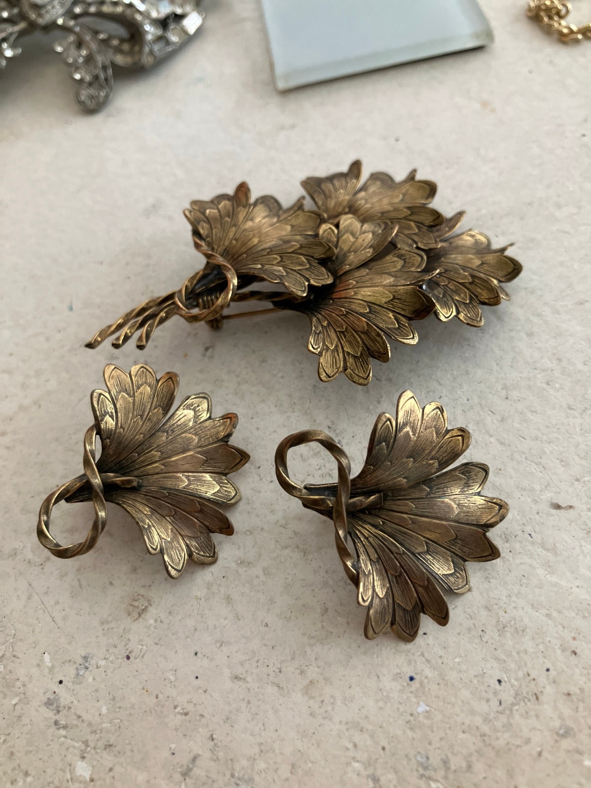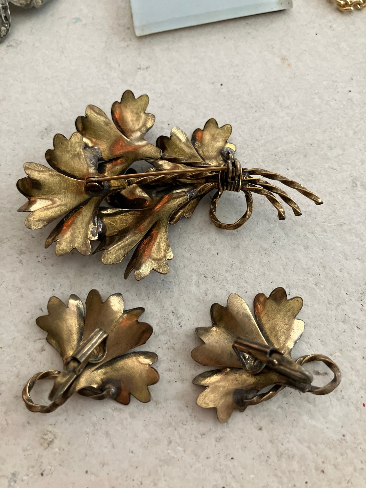 The set shows a beautiful aged patina with some wear to the gold wash on the high points of the leaves. The pin mechanism and earring clips appear functional. Original patina is preferred by collectors; do not polish. Condition is good for its age. Complete sets (parures) in the original gold wash are highly collectible.