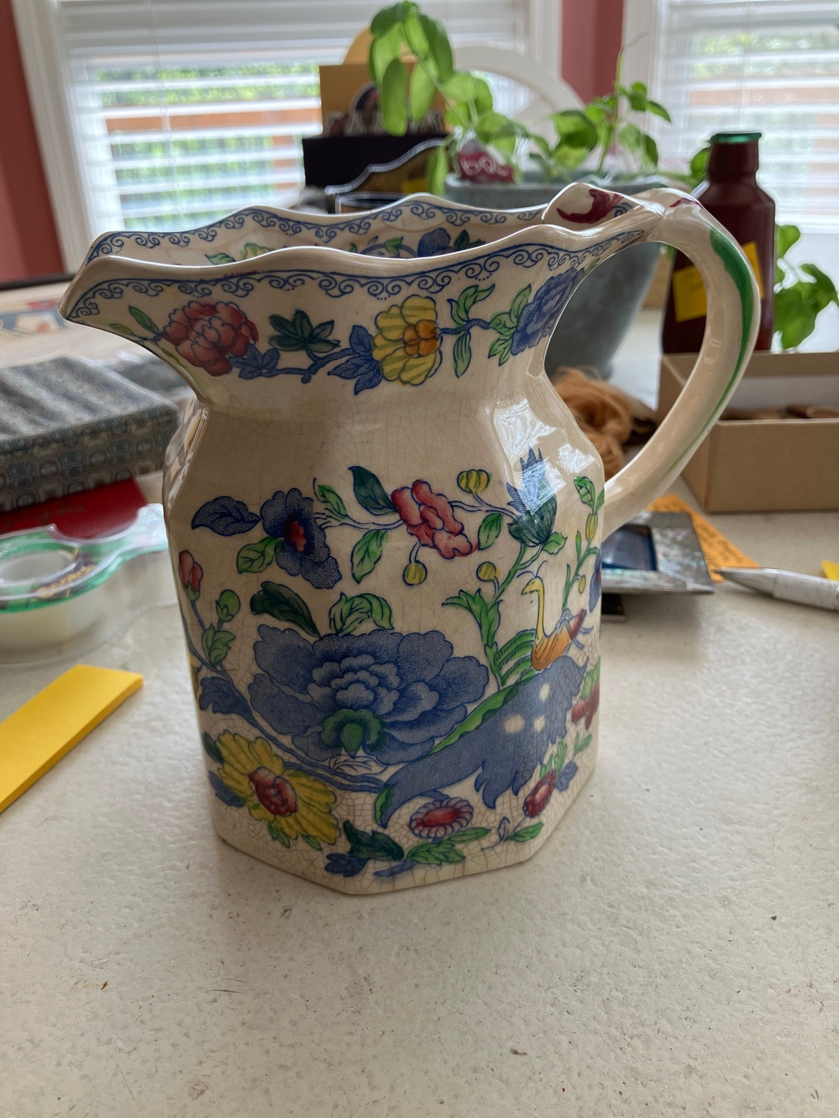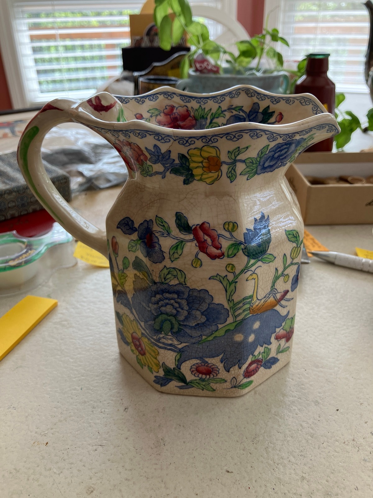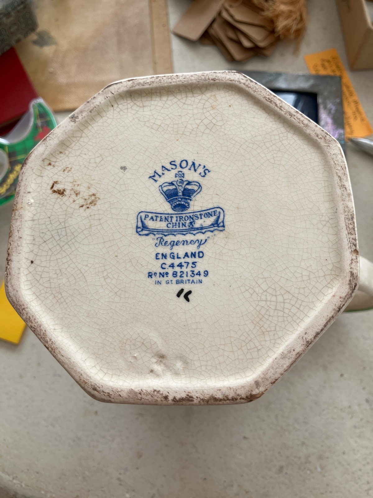 Registered in 1937 under number 821349, this pattern was a 20th-century revival of the bold, 'Imari-inspired' styles that made Mason's famous in the 1800s. It was designed to bring the luxury of hand-painted porcelain to the everyday family table. This specific pitcher likely served as a water or milk jug in a bustling English kitchen.