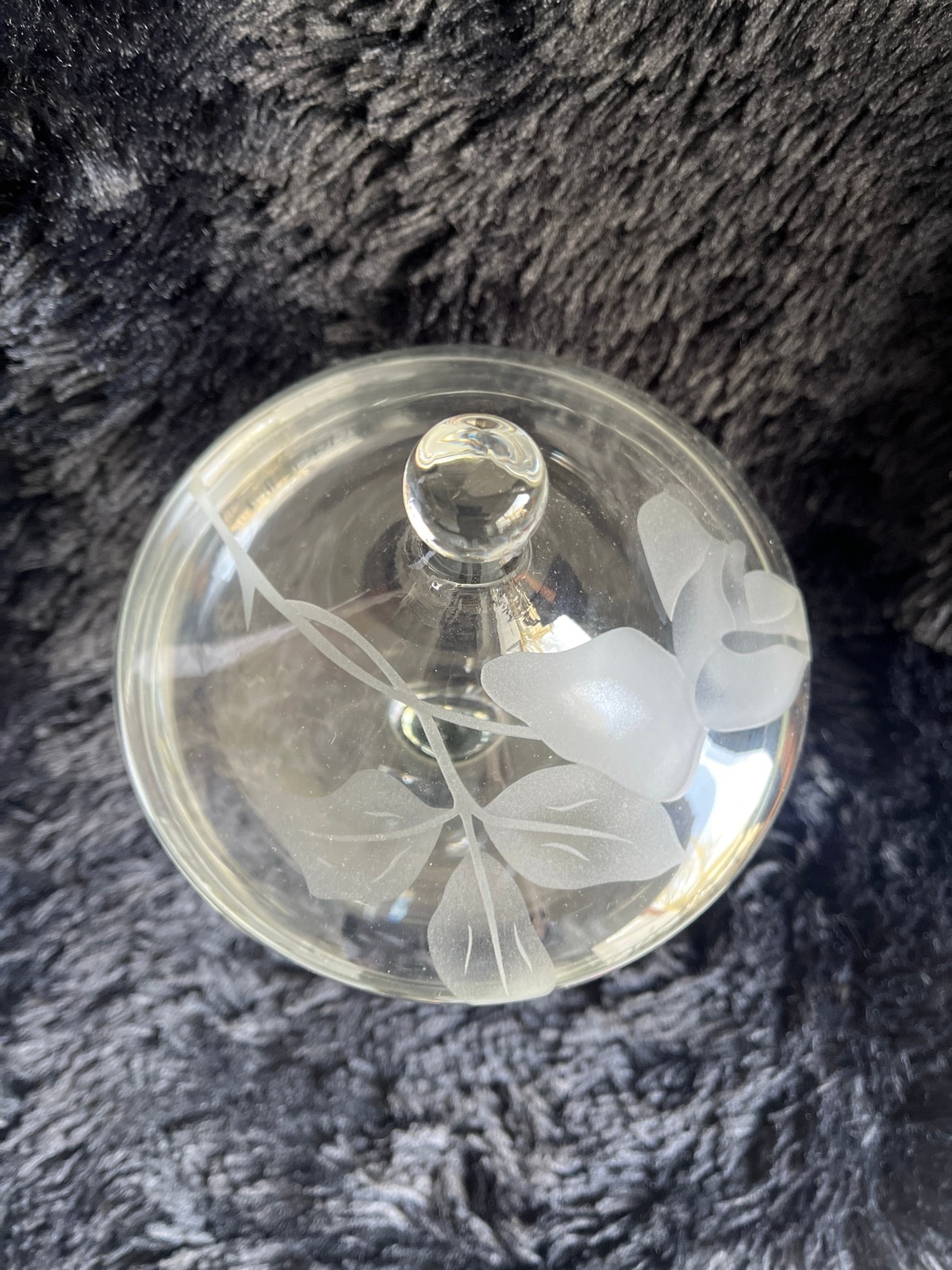The glass appears remarkably clear with no visible 'sick glass' (cloudiness from dishwasher use). The finial and stem look intact, though the inner rim of the lid should be checked for small chips. Excellent preservation of the frosted design. Condition is consistent with a well-cared-for cabinet piece.