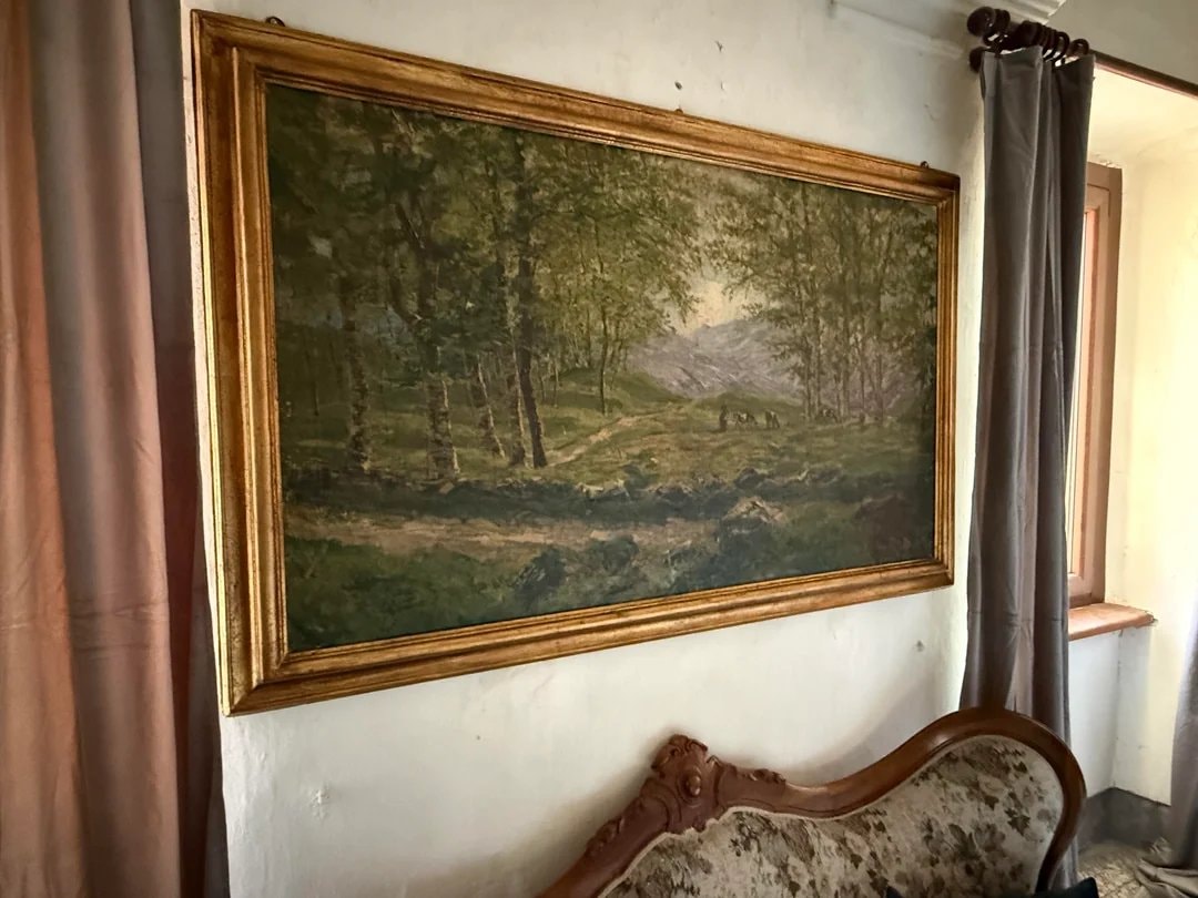 The painting appears to be in good stable condition, though the canvas looks slightly loose on its stretcher in the wide shot. There is some expected surface grime and minor craquelure consistent with age. The period frame shows some typical wear to the gilding but appears original to the piece, which adds significant value.