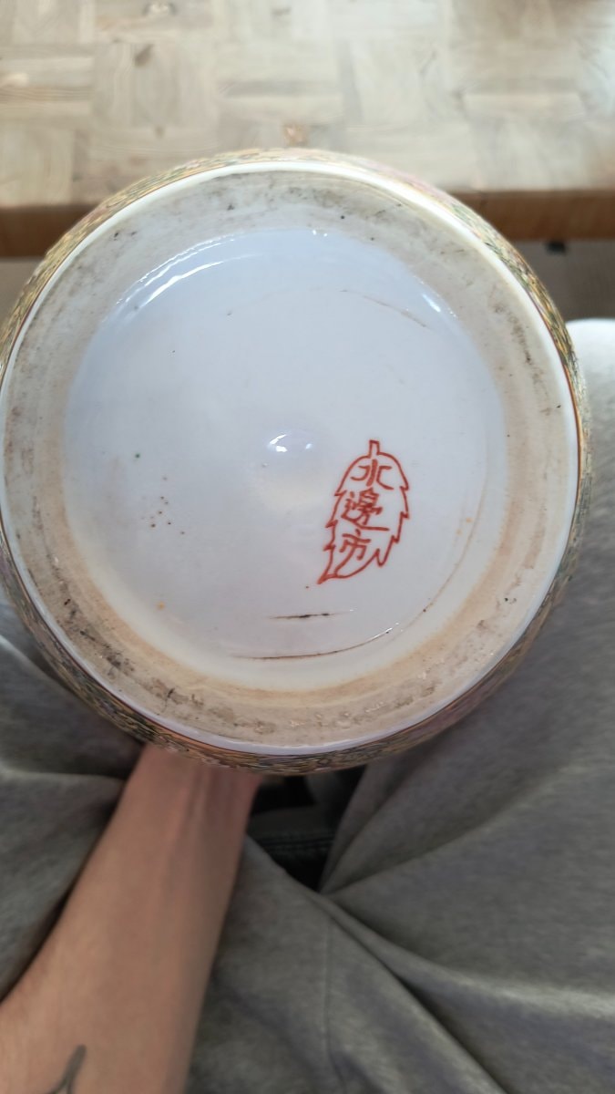 While the specific artist is unnamed, the red leaf mark on the base is a classic hallmark of the mid-century export period, often associated with workshops that specialized in 'overglaze' decoration.