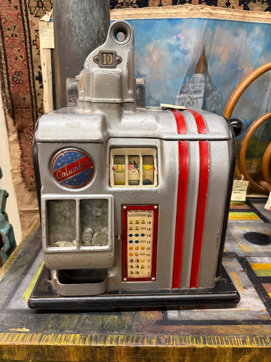 Shows honest age-related wear to the silver and red enamel paint, consistent with a machine that saw heavy use. The reel strips appear original but slightly yellowed, and the jackpot windows are impressively full, which adds to its 'as-found' charm. Original condition is often preferred by collectors over over-restored pieces.