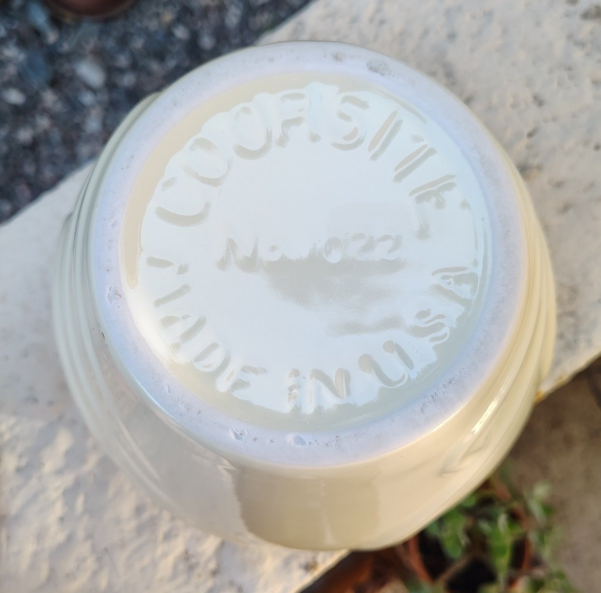 A classic piece of American industrial history, this cream-colored porcelain planter features an elegant embossed scroll motif and a high-gloss 'ivory' glaze.