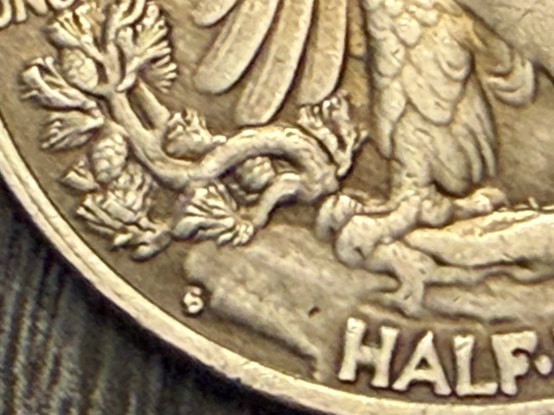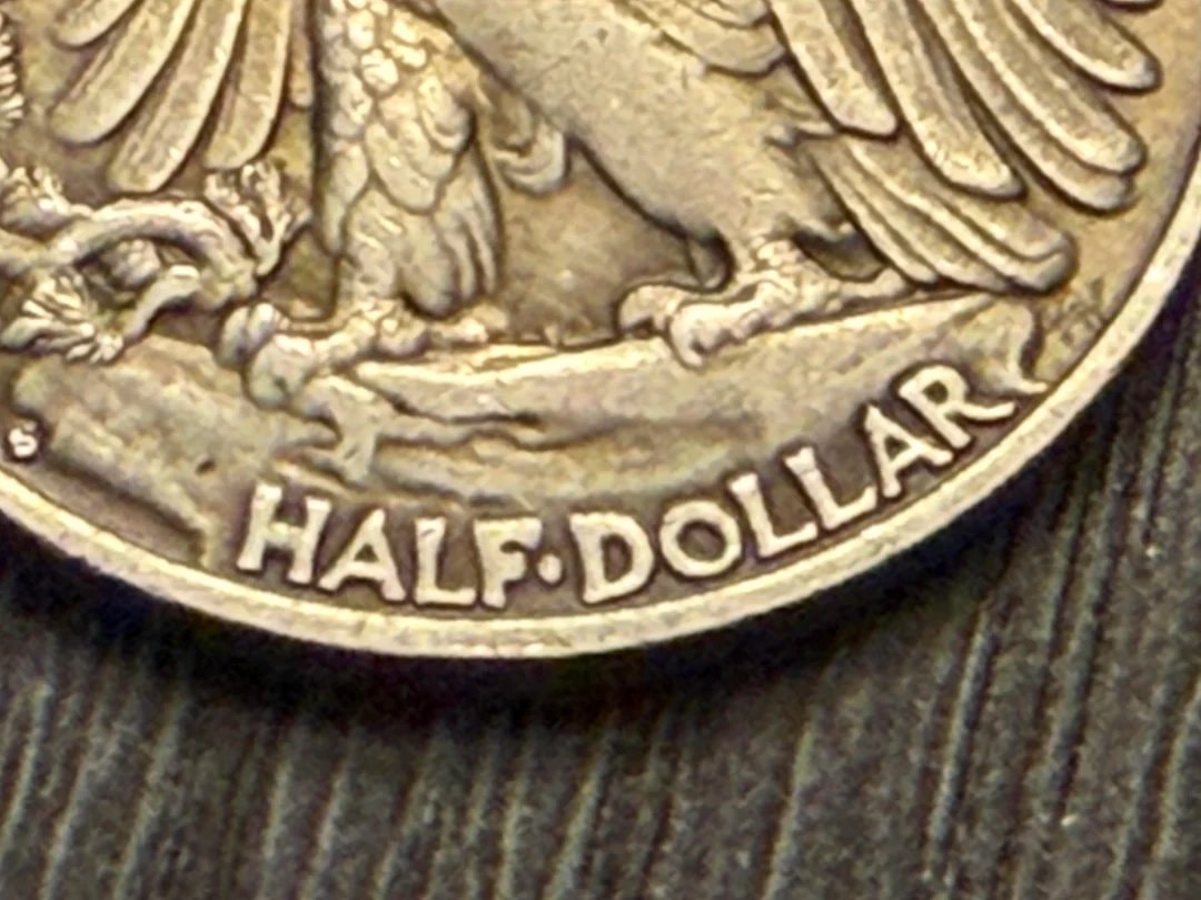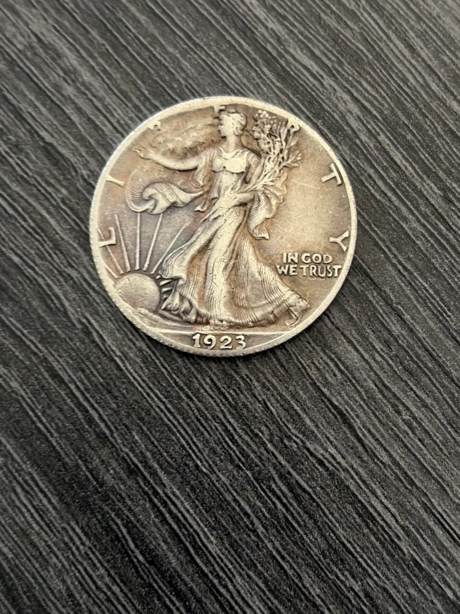 Visual evidence definitively confirms the date '1923' on the obverse and the 'S' mint mark on the reverse, locking the identification to a 1923-S Walking Liberty Half Dollar.