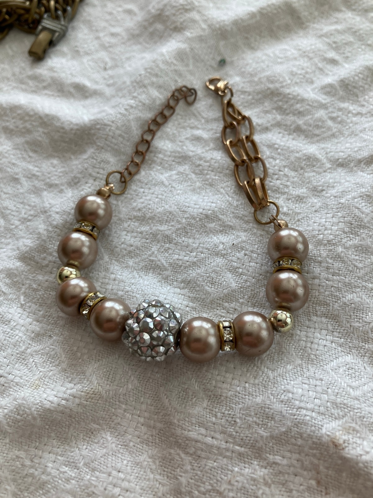 The bracelet appears to be in good wearable condition. There is some minor surface wear on the pearl coating and slight oxidation on the chain links, which is common for base-metal jewelry. This typical wear keeps the value in the modest range. Value is based on the current market for unbranded contemporary costume jewelry.