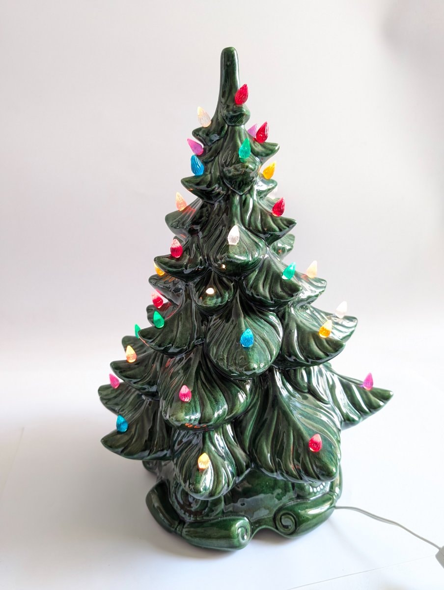 The glaze appears vibrant and well-preserved. The tree is missing its traditional star topper, which is easily replaced but currently absent. Ensure all plastic bulbs are present and the internal wiring is safe for modern use. The absence of the star reduces the value by approximately $15–$25.