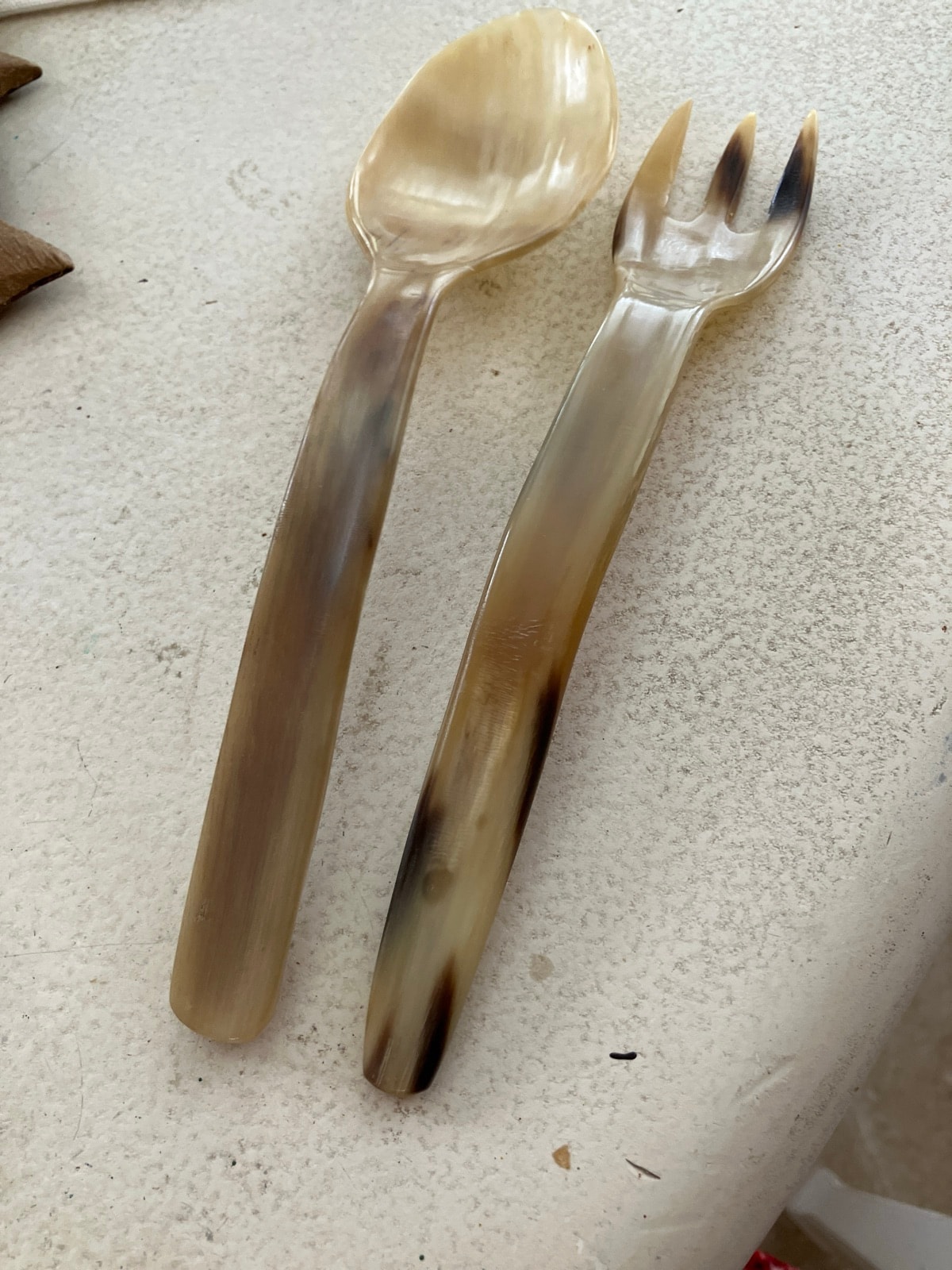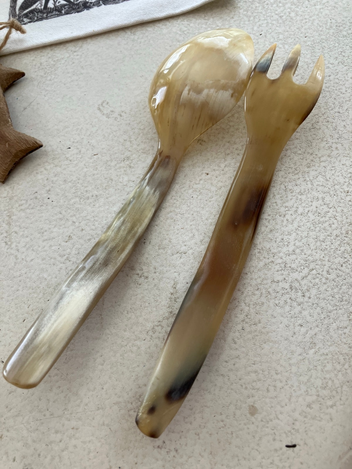 The servers show light surface scratches and minor 'delamination' typical of aged organic material. There are no visible chips to the fork tines or spoon edge, which preserves their utility and value. Regular oiling with food-grade mineral oil will prevent further drying.