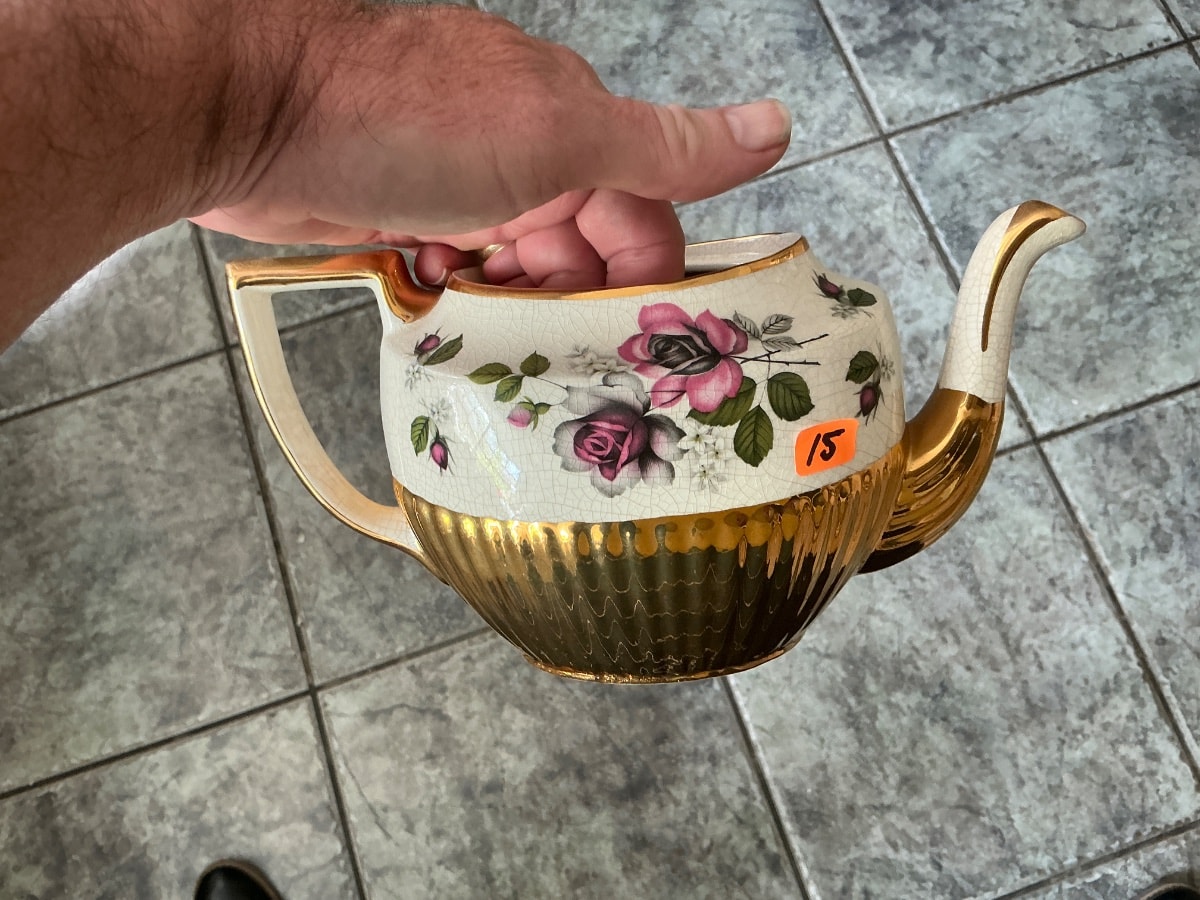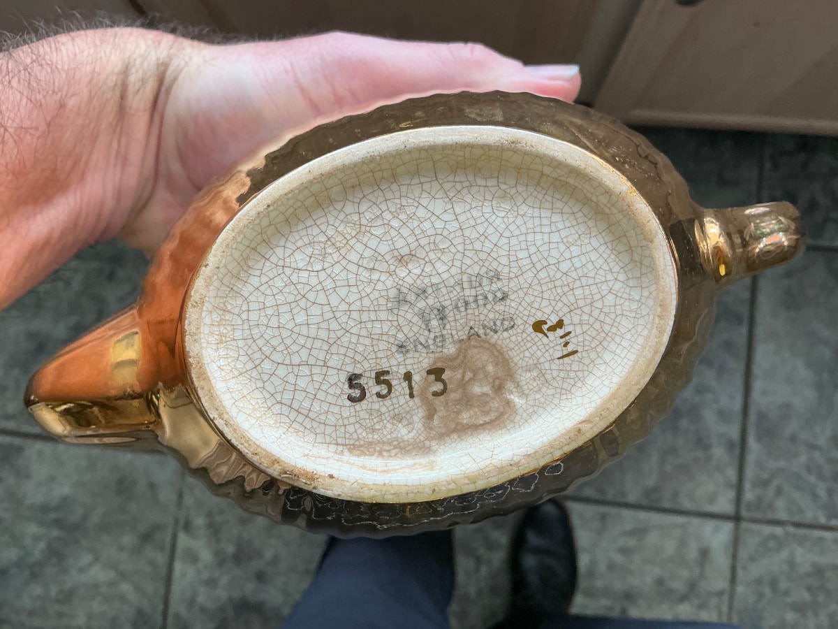 The teapot exhibits significant 'crazing'—the fine network of cracks in the glaze—which is extremely common for Arthur Wood earthenware of this age. There is visible wear to the gold luster on the spout and handle consistent with use.
