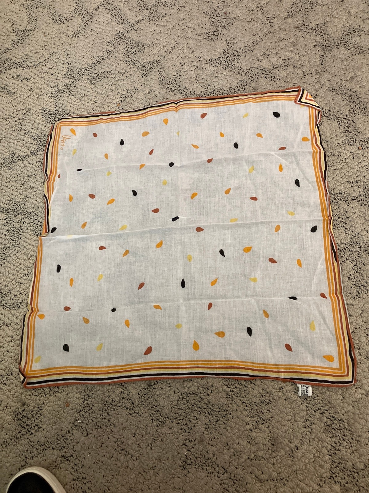 A classic mid-century textile accessory featuring Vera Neumann's signature whimsical, hand-painted aesthetic. This piece showcases a minimalist 'raindrop' or 'seed' motif in an autumnal palette of ochre, sienna, and black, framed by a multi-stripe border.