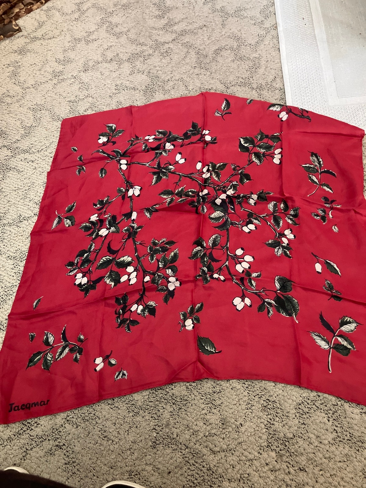 A vibrant red silk scarf featuring a hand-screened botanical illustration of rosehips and foliage. Jacqmar was the premier British scarf house of the mid-century, known for their high-quality silk and artistic collaborations.