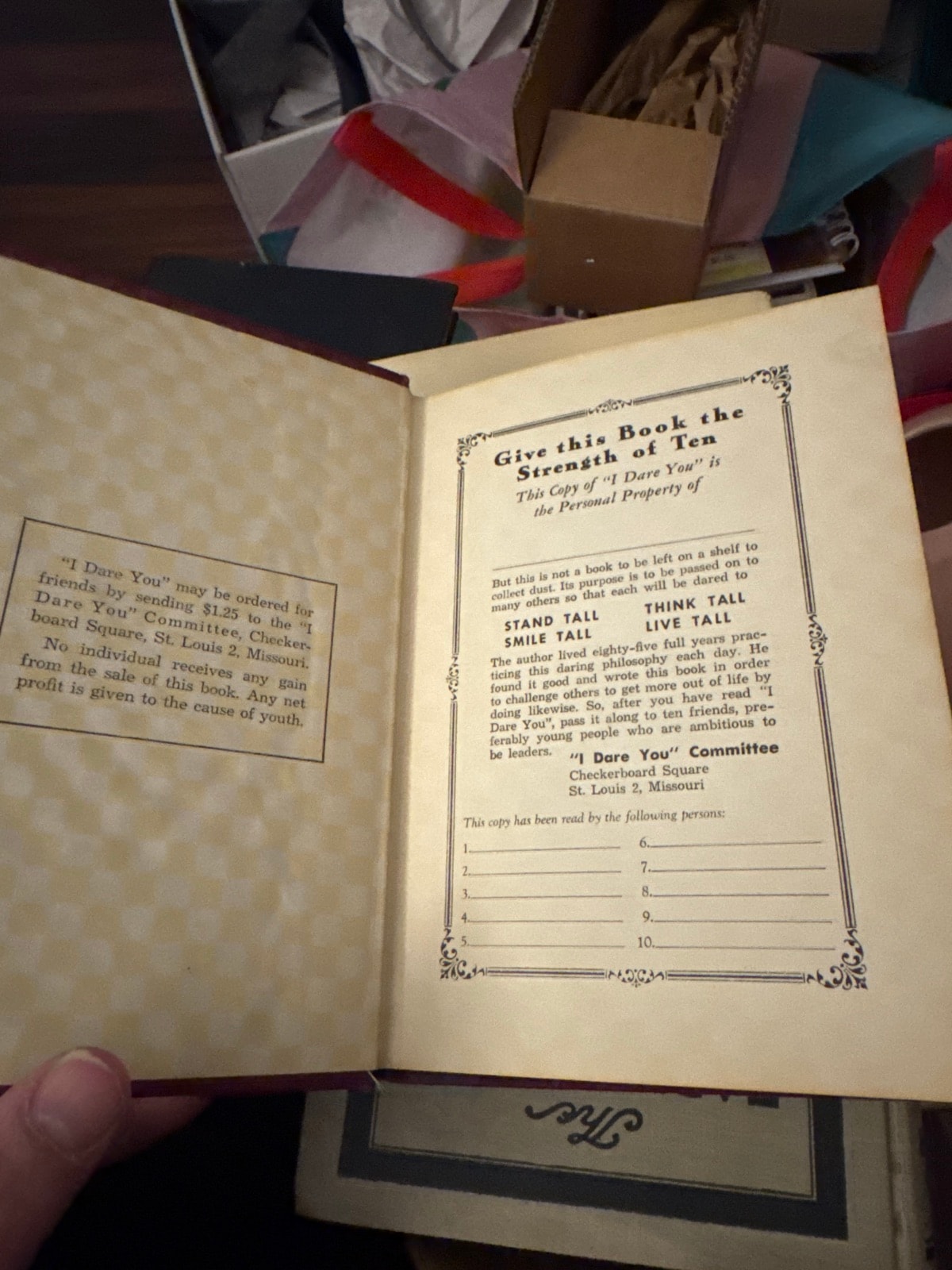 A classic of American motivational literature, this 1960 privately printed edition features a distinctive embossed burgundy cover with a geometric sunburst pattern. Written by the founder of Ralston Purina, it was designed as a 'living book' intended to be passed from person to person to inspire leadership.