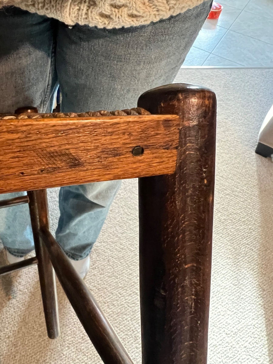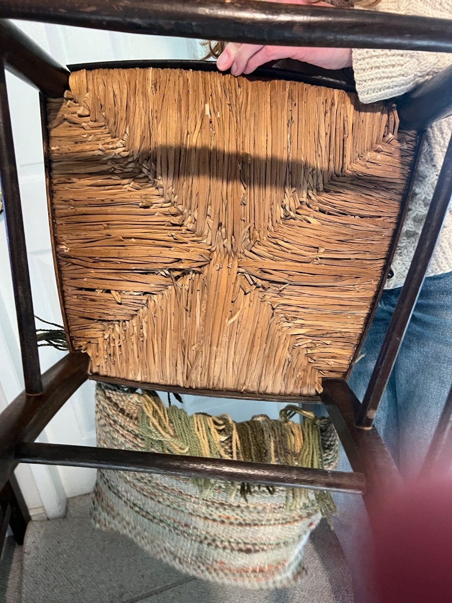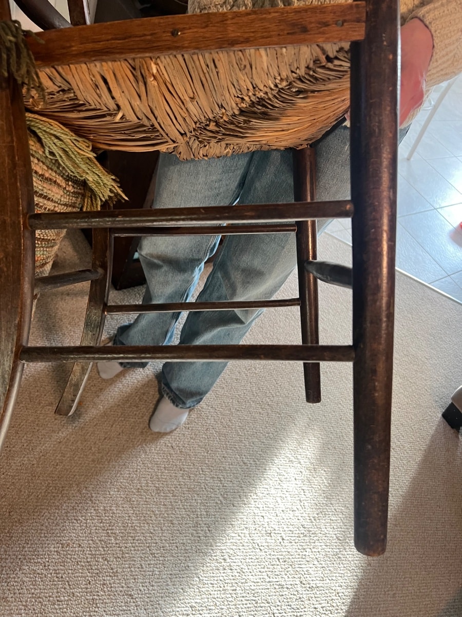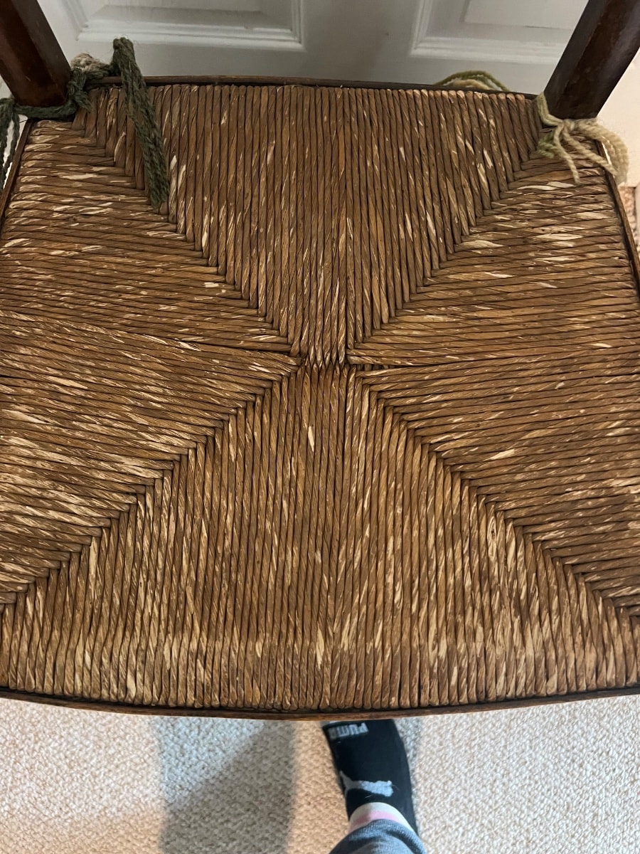 The chair appears to be in very good antique condition. The wood has a rich, dark patina with honest wear consistent with age, particularly on the lower rungs where feet would have rested. Most importantly, the rush seat is remarkably intact with no significant fraying or sagging.