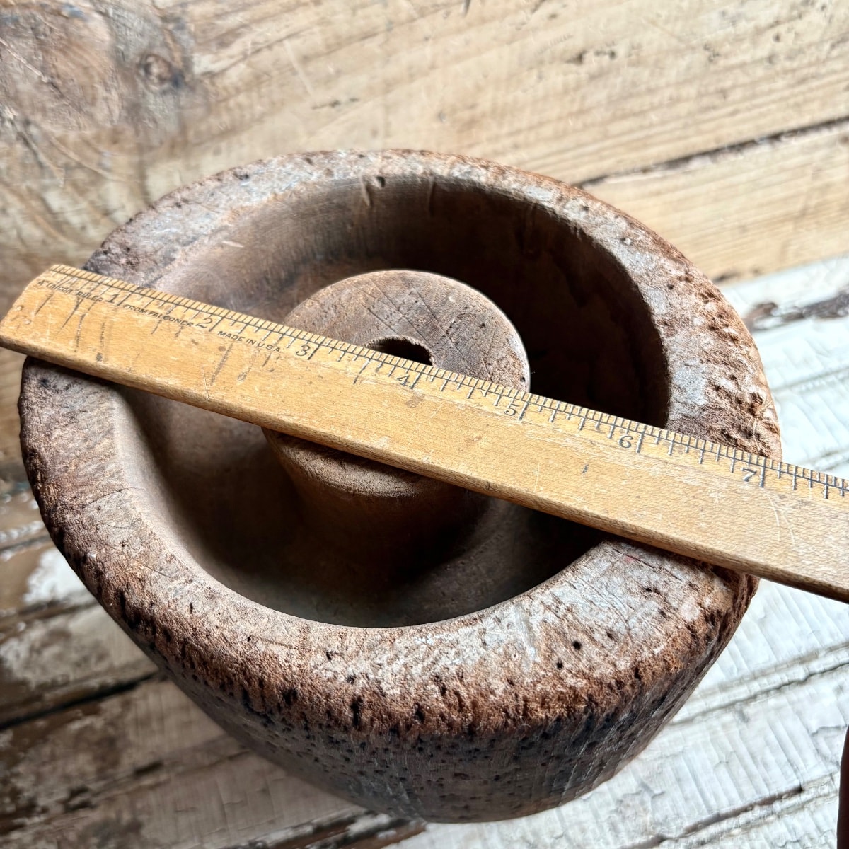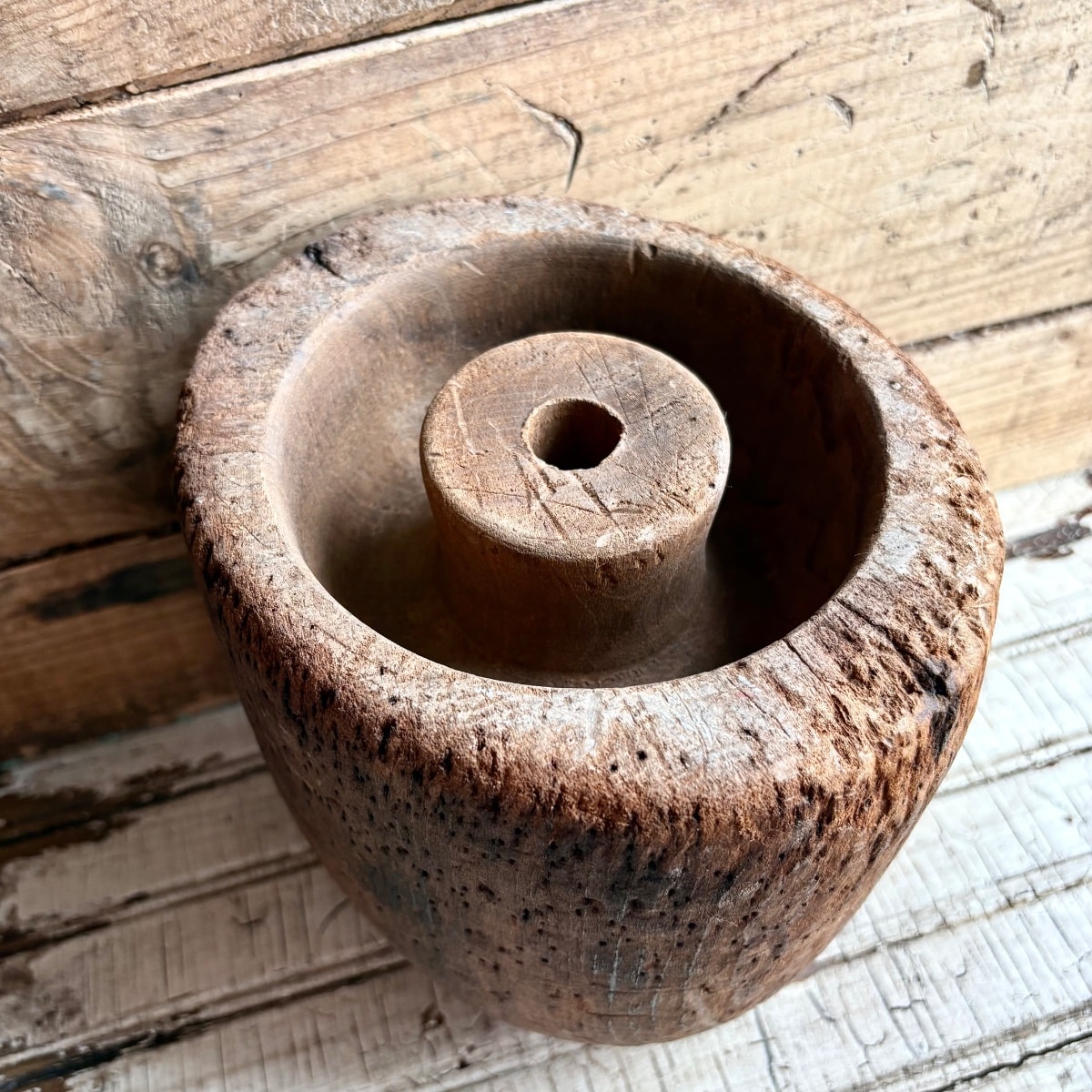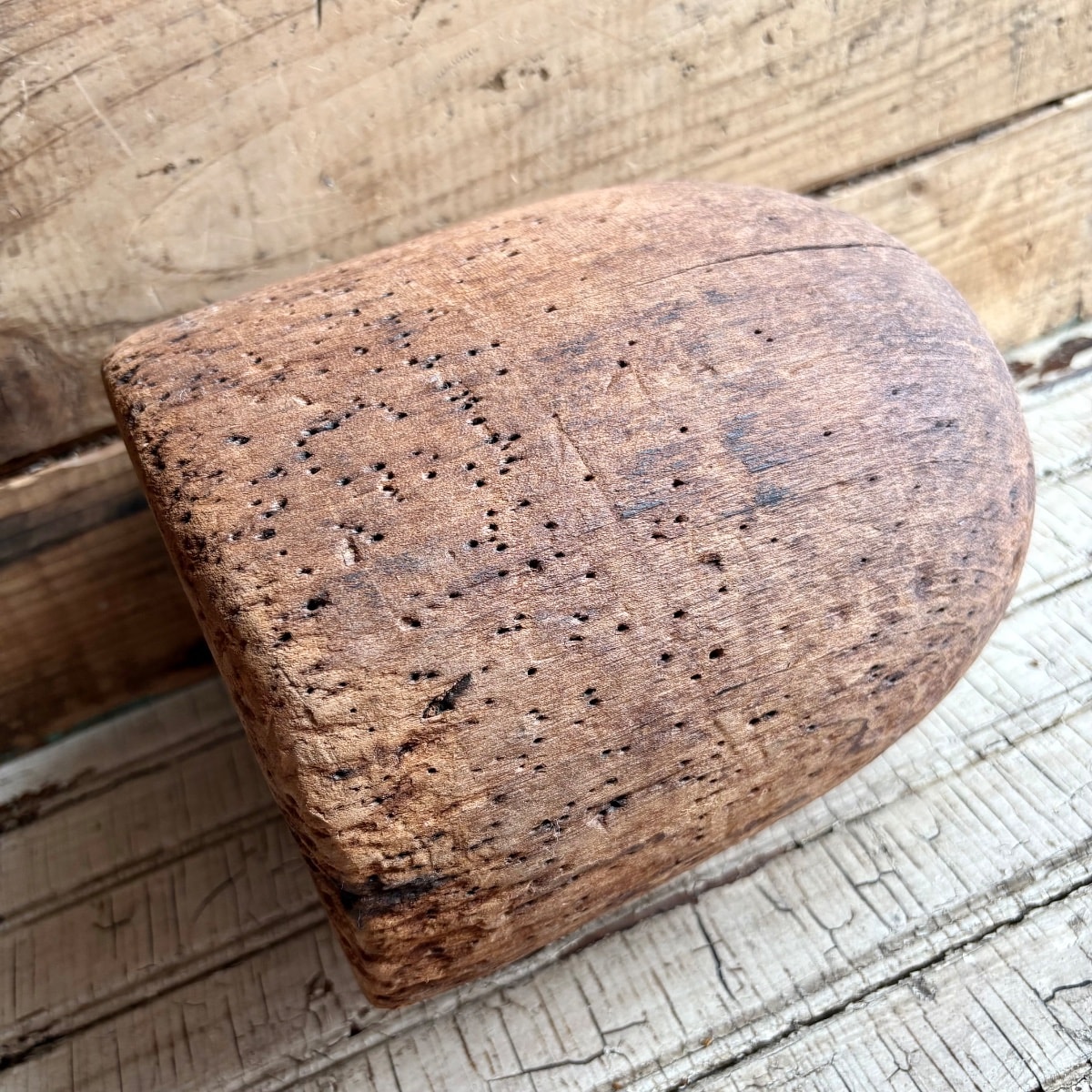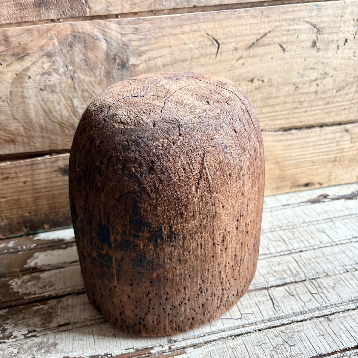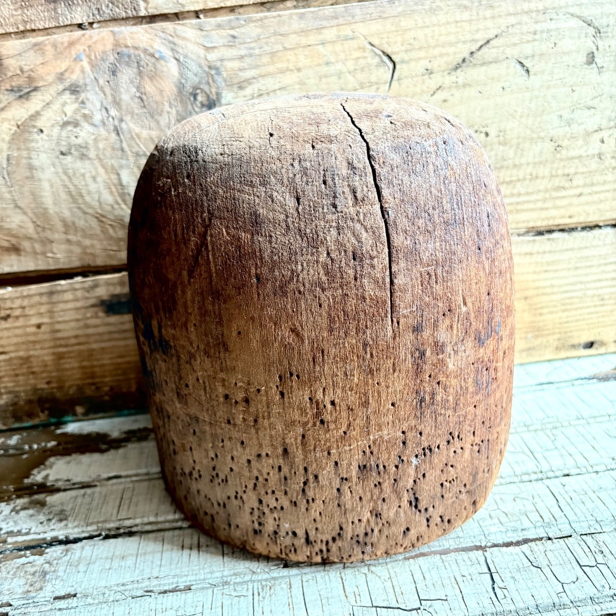 The wood shows significant age-related cracking (checking) and heavy pin-hole wear, which is expected and actually desired by collectors of industrial primitives. The dark staining suggests it saw heavy use in a working shop. These 'flaws' confirm its authenticity. Values for primitive hat blocks depend on size and sculptural appeal.