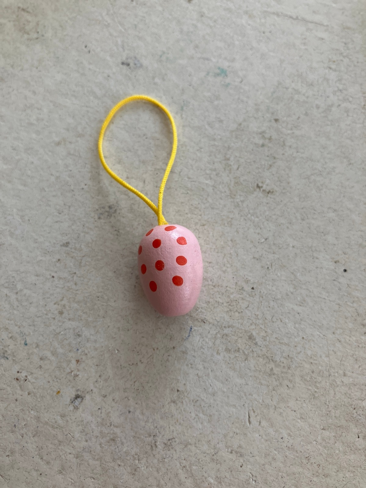 A charming miniature wooden egg, hand-turned and finished with a vibrant pink base and precise red polka dots. It features the signature yellow cord loop characteristic of vintage German folk art ornaments.