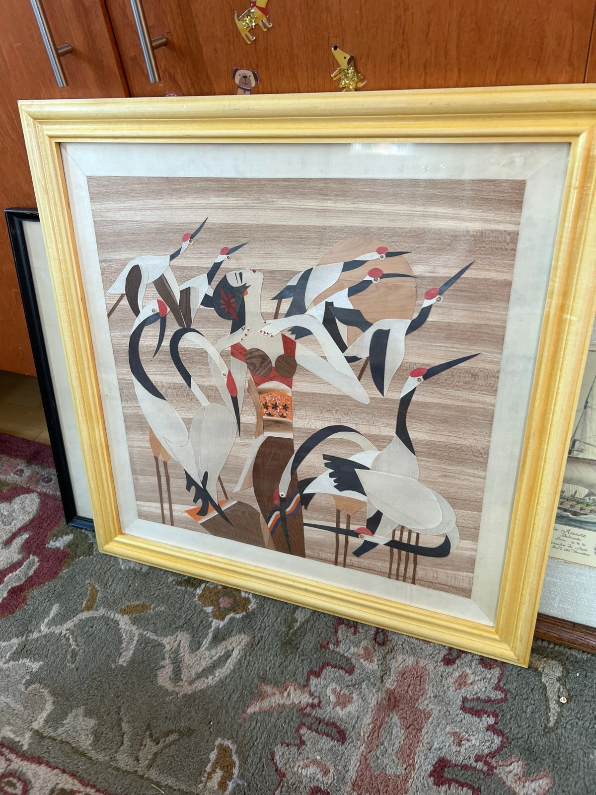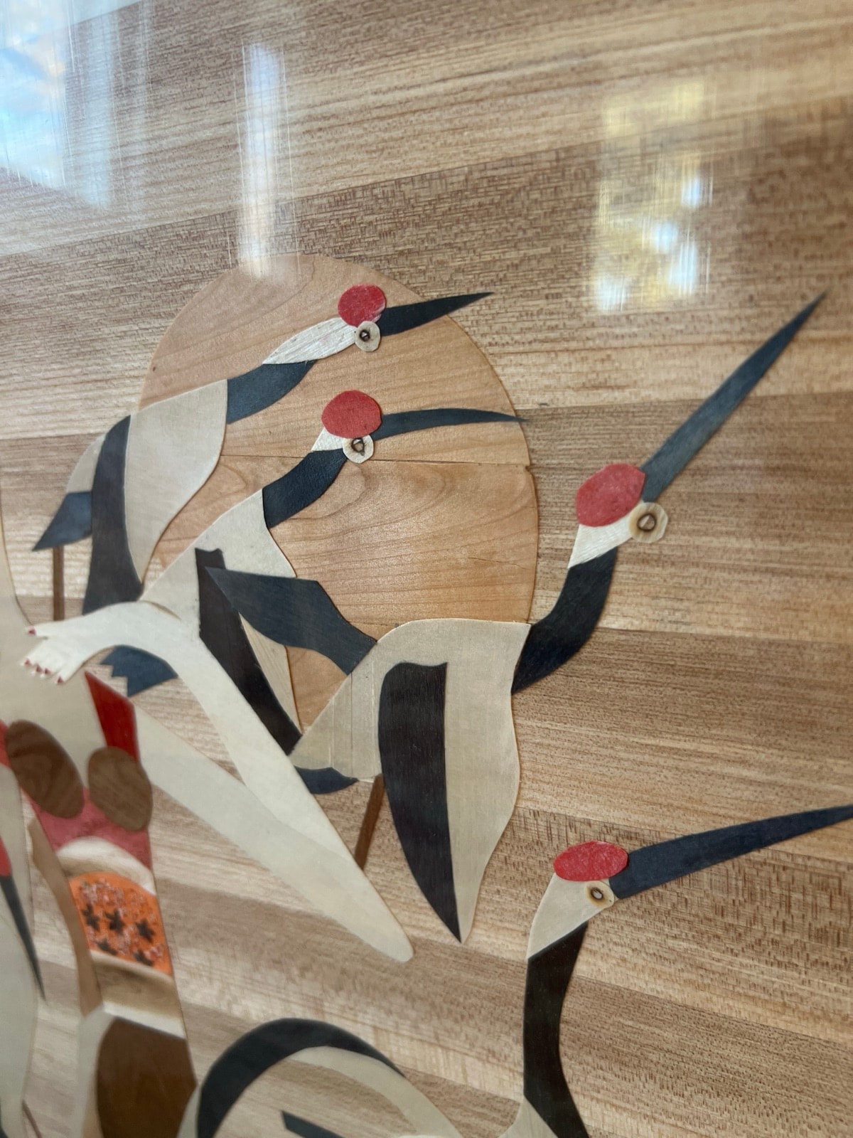 A striking example of wood marquetry, this piece uses various natural wood veneers to create a stylized scene of a woman surrounded by cranes. The composition is highly graphic, blending traditional Asian motifs with a Mid-Century Modern aesthetic.
