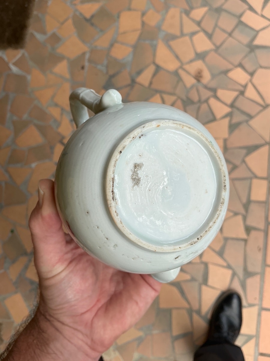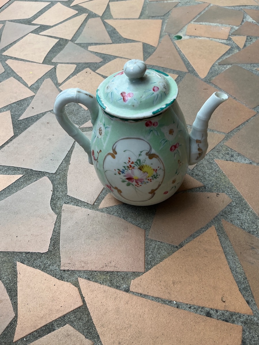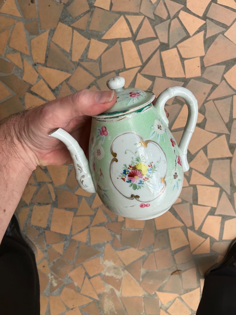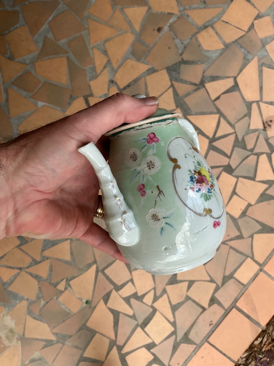 Visible chipping on the tip of the spout and significant wear/flea bites around the rim of the lid. The gilding on the cartouche borders has rubbed away in several areas. These condition issues reduce the value by approximately 50-60%.
