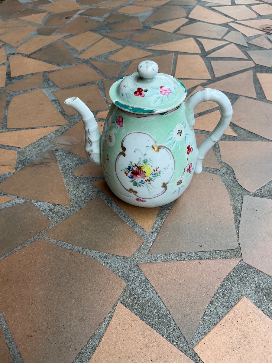 Nineteenth-century potters in Jingdezhen created these vibrant wares to satisfy a global obsession with 'Exotic' color. The bamboo-shaped handle isn't just a design choice; it represents the scholar's ideal of flexibility and strength.