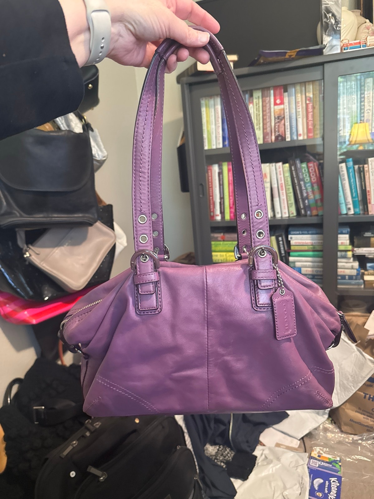 A vibrant 'Berry' purple satchel from Coach's popular Soho collection, crafted from supple full-grain cowhide leather. It features adjustable double straps with silver-tone grommet accents and the iconic embossed leather creed patch inside.