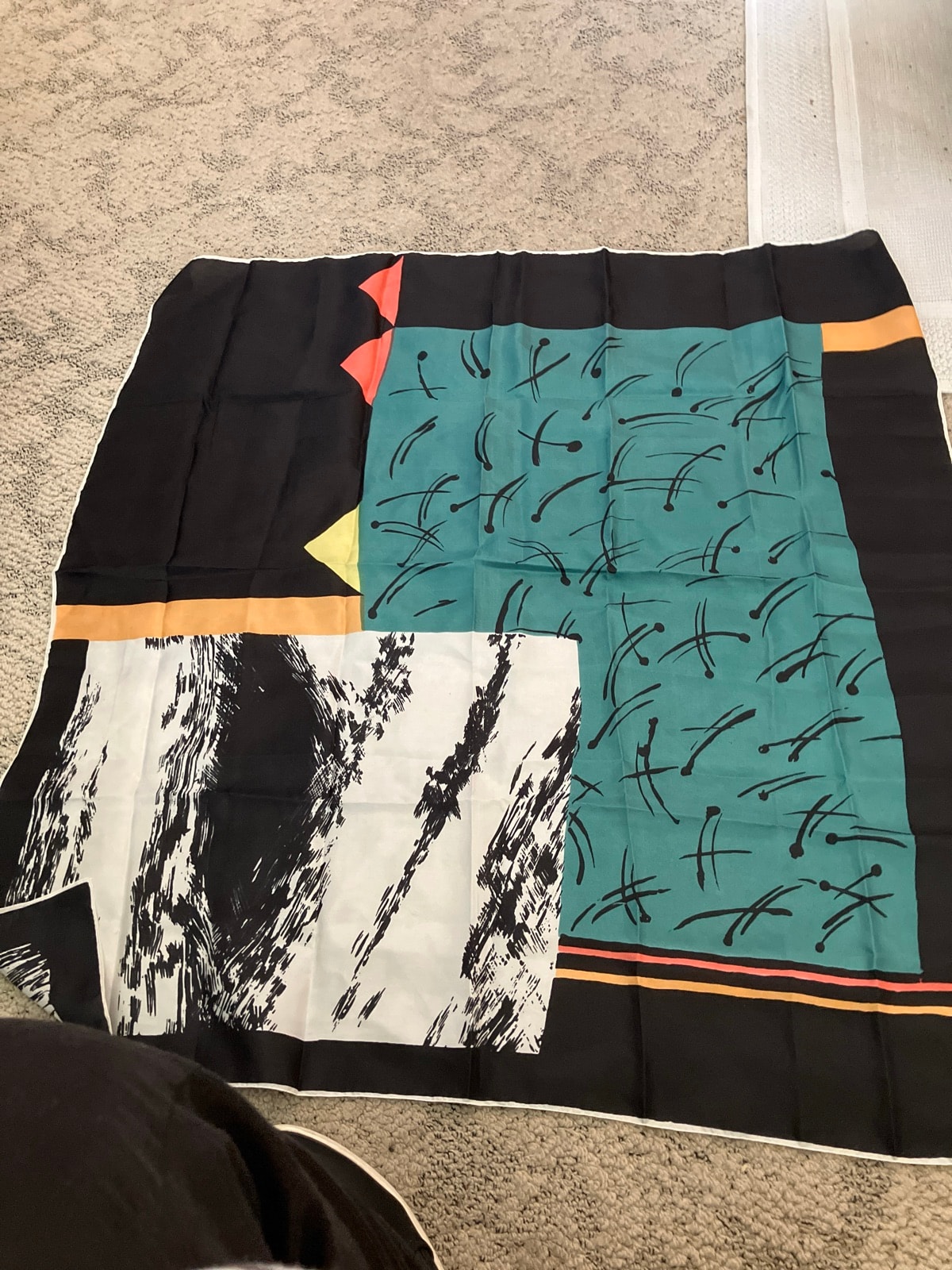 The scarf shows prominent fold lines from long-term storage and some minor rippling. No visible snags or stains are apparent in the photo, but silk is prone to 'shattering' if kept in dry conditions. The crispness of the colors suggests it has been kept out of direct sunlight.