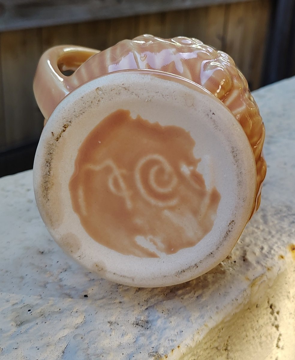 This is a classic American art pottery pitcher featuring a high-relief 'Vineyard' motif of grapes and leaves, finished in a warm, lustrous peach-toned glaze.