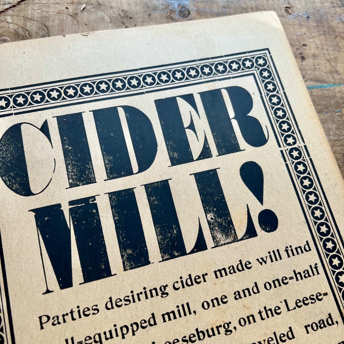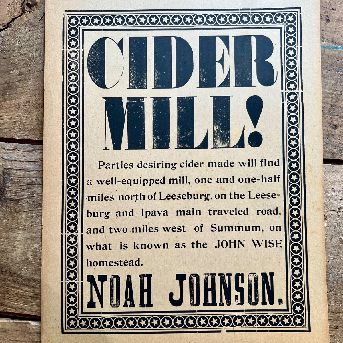 A rare American letterpress broadside advertising the cider-making services of Noah Johnson at the John Wise homestead. This ephemeral handbill features bold wood-type typography and a distinctive star-and-circle decorative border characteristic of rural 19th-century job printing.