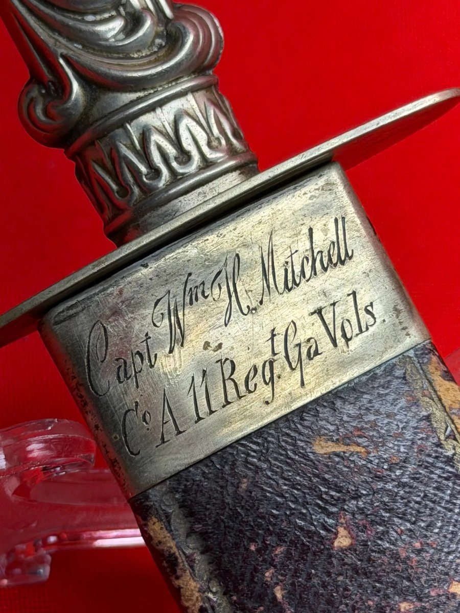 A stunning mid-19th century sidearm featuring a Rococo-style silver-plated hilt and a leather scabbard with a personalized throat. The engraving identifies it as belonging to Captain William H. Mitchell of Company A, 11th Regiment Georgia Volunteers, a unit that fought in the most pivotal battles of the Eastern Theater.