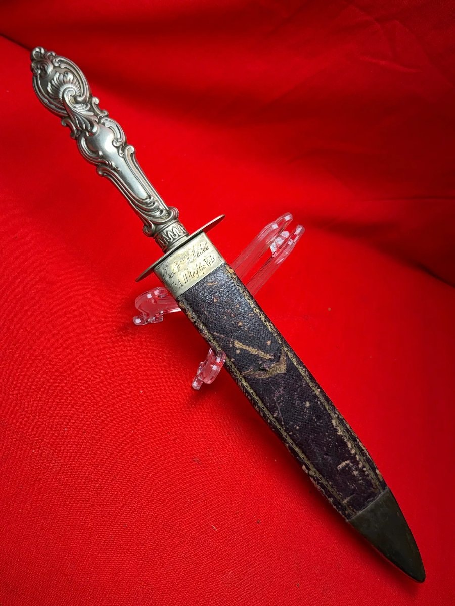 The leather scabbard shows significant age-related wear and surface loss, which is expected for a field-used item. The silver plating on the hilt remains largely intact, and the engraving is crisp and legible. Condition is fair to good for its age; the scabbard's fragility reduces the high-end potential slightly.